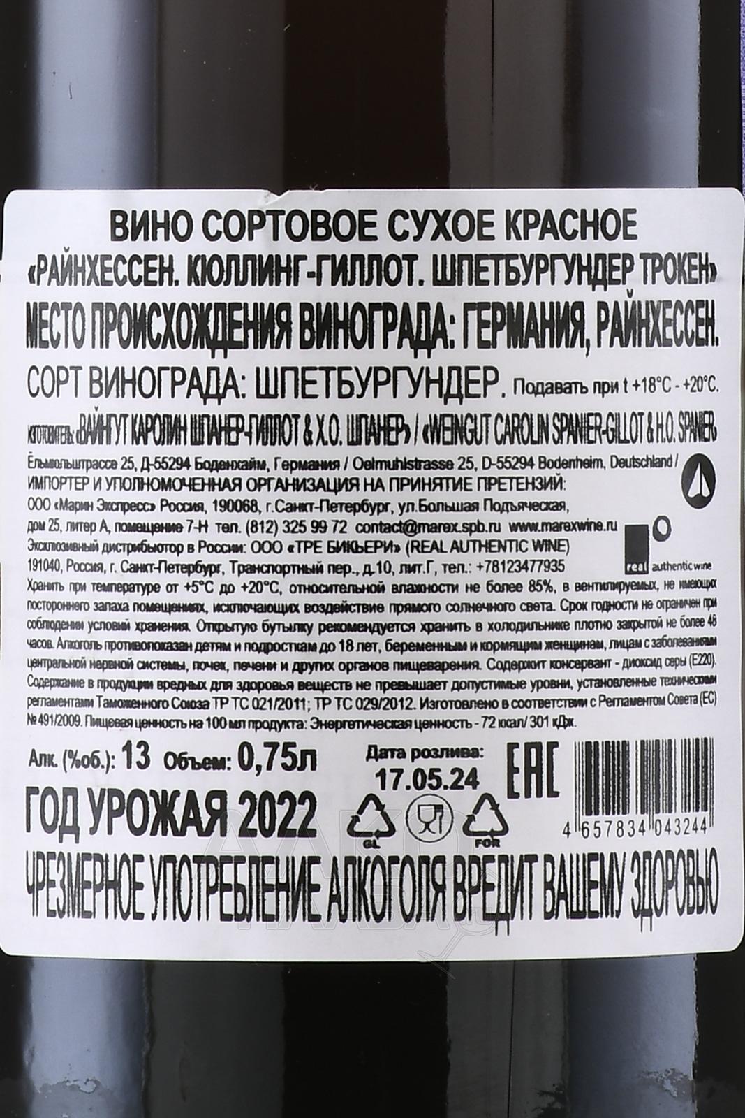 Красное сухое вино Kuhling-Gillot Spatburgunder 0,75 л — напиток премиум-класса из Германии, в котором присутствует только один вид винограда, распространенный в области Рейнгессен (его название можно увидеть в наименовании спиртного). Букет алкоголя в полной мере отражает терруар данного региона — все благодаря бережным процедурам обработки спелого сырья и применению урожая удачного года. Биодинамическое вино ферментировалось без добавления консервантов, после чего его подвергли выдержке в небольших дубовых барриках длительностью 1 год и 8 месяцев.