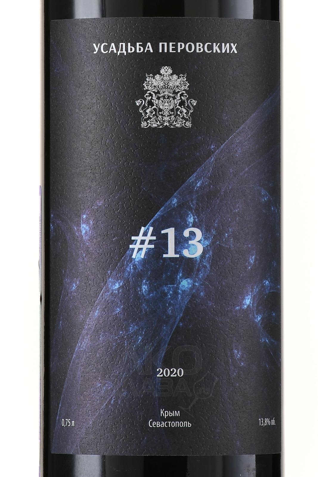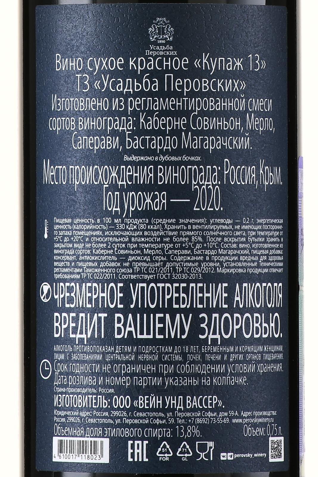 Вино Купаж #13 ТЗ Усадьба Перовских — красное сухое вино насыщенного рубинового цвета. В аромате чёрные ягоды, пряности, ваниль. Вкус демонстрирует гармоничное сочетание оттенков смородинового джема, ежевики, ванили с зрелыми танинами и ярким, длительным послевкусием. Рекомендуется подавать при 16-18 °С. Сочетается с мясными блюдами приготовленными на гриле и мангале. Вино выпущено в бутылках разных объемов 0,75 л и 1,5 л.