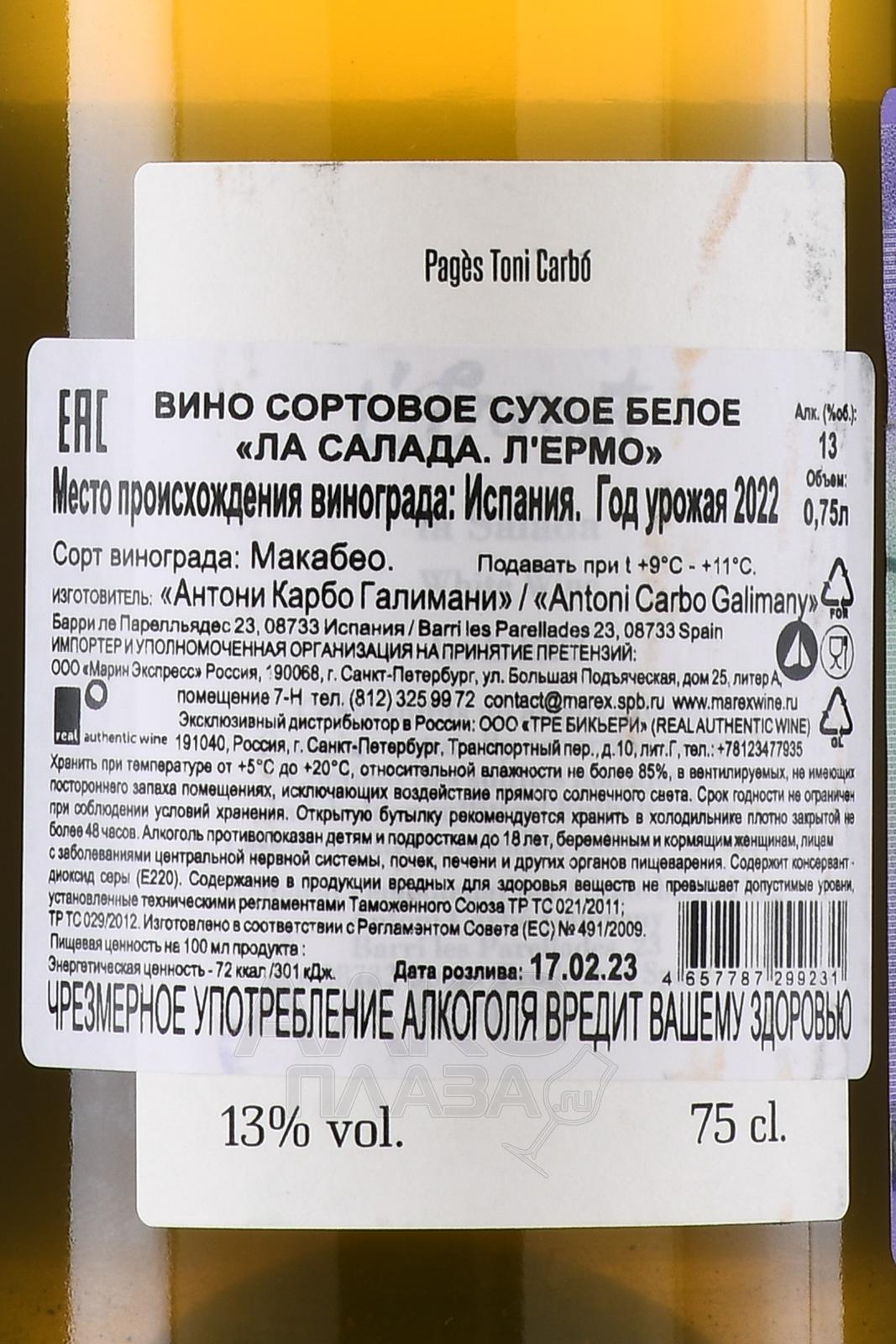 Белое сухое вино La Salada L`Ermot 0,75 л производится в Каталонии, в районе Пенедес, где виноградники расположены на высоте около 250 метров над уровнем моря. Почвы здесь известково-глинистые, с высоким содержанием минералов, что придает напиткам выразительную структуру и свежесть. Хозяйство создано Тони Карбоном, известным сторонником натурального виноделия, и работает по принципам органического земледелия. Все процессы — от сбора урожая до розлива — выполняются вручную. Сусло ферментируется спонтанно на диких дрожжах без добавления серы и без фильтрации, что позволяет сохранить подлинный характер местных сортов и чистоту терруара.