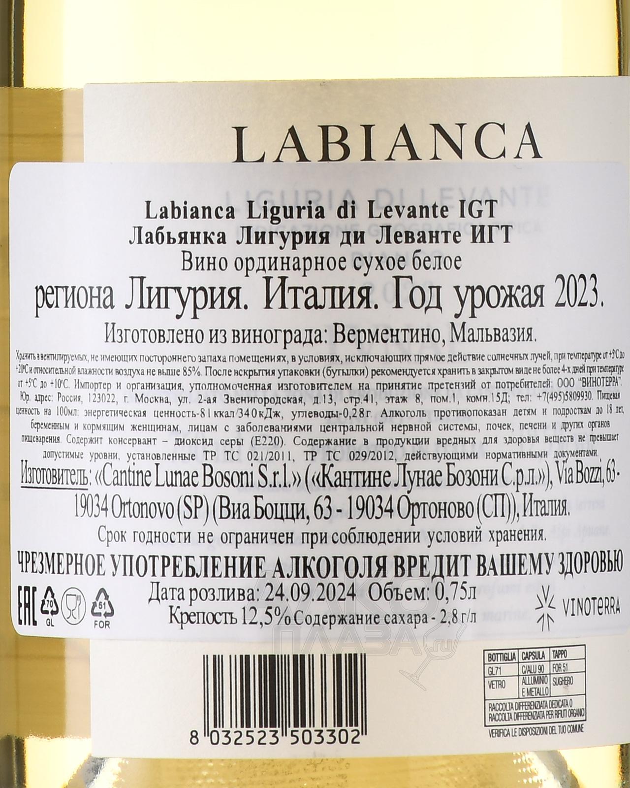 Белое сухое вино Labianca Liguria di Levante IGT 2022 год 0,75 л — итальянский алкоголь, который относится к классу купажированных версий ввиду особенностей состава: он сочетает два вида винограда с угодий Лигурии (плантации располагаются между морем и горами), сорванные с лоз в один и тот же год. В процессе ферментации поддерживался строгий режим температур, а четырехмесячная выдержка протекала на тонком осадке.