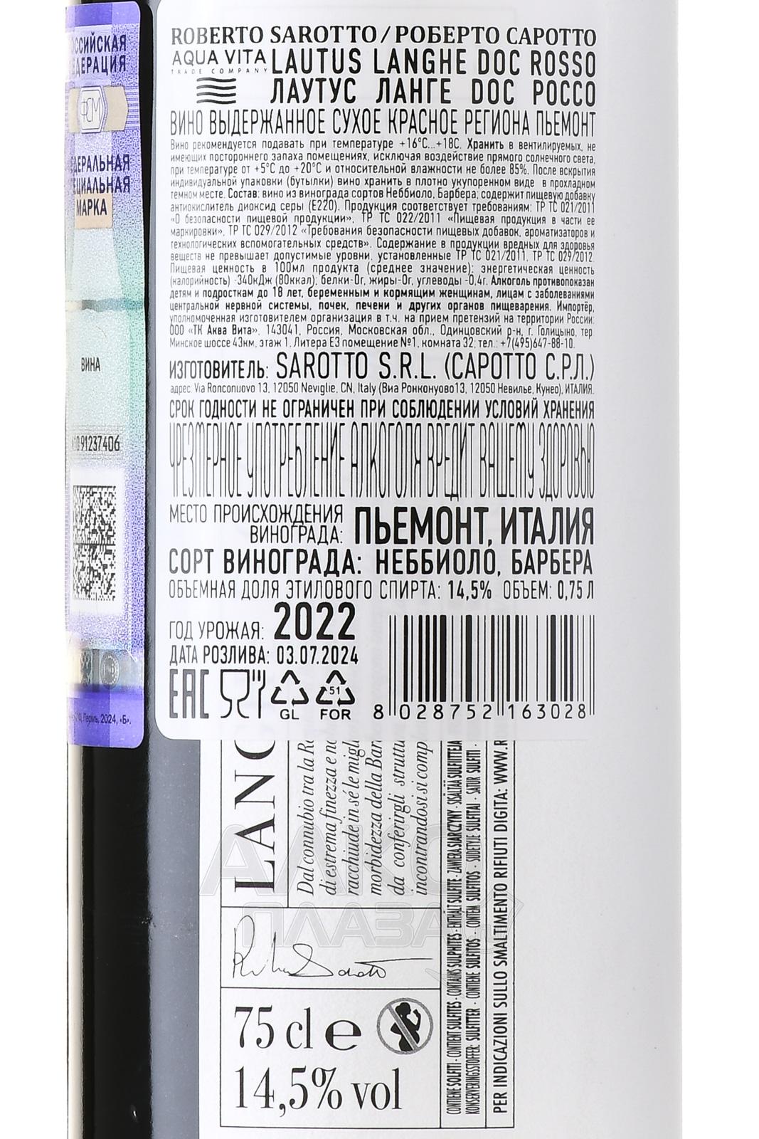 Красное сухое вино Langhe DOC rosso Lautus Roberto Sarotto 2022 г. 0,75 л — купаж из ягод двух итальянских автохтонов, распространенных в пьемонтском в регионе Ланге. Виноград вырастили на известково-глинистых почвах в окрестностях Невилье. Сбор урожая проходил в конце сентября и начале октября. Год был тёплым и стабильным, что обеспечило равномерное созревание плодов. Винификацию провели традиционным способом брожения на мезге с последующей выдержкой в дубе. Название напитка в переводе с латыни означает «изысканный» и полностью отражает характер бленда, сочетающего мягкость Барберы и строгую танинную структуру Неббиоло.