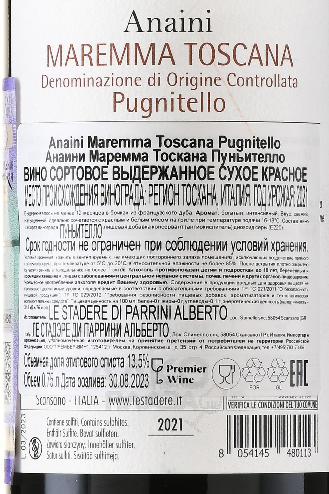 Красное сухое вино Le Stadere Anaini Pugnitello Maremma Toscana 0,75 л создано в прибрежной зоне Маремма на юге Тосканы, где виноградники соседствуют с лесами и получают влияние тёплого средиземноморского климата и морских бризов. Название отсылает к знатной этрусской семье и символизирует древние корни местного виноградарства, зародившегося именно в этих местах. В основе лежит автохтонный сорт, характерный для провинции Гроссето и получивший имя за форму грозди, напоминающую сжатый кулак. После дробления и гребнеотделения сусло мацерируется на кожице в стальных ёмкостях около пятнадцати дней с делестажем при контролируемой температуре, не превышающей 28 °С. Затем проводится мягкое прессование и яблочно-молочное брожение в цементных чанах. Созревание начинается в цементе и продолжается двенадцать месяцев во французских тонно второго использования, что позволяет сохранить сортовую выразительность и подчеркнуть пряный характер без доминирования дуба.