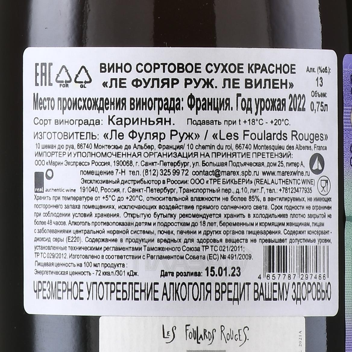 Красное сухое вино Les Foulards Rouges Les Vilains 0,75 л — это напиток, который демонстрирует характер южного французского юга и подчёркивает дух винодельни Ле Фуляр Руж. Происходит образец из района Côtes du Roussillon в регионе Лангедок-Руссильон, неподалёку от Средиземного моря и Пиренеев, с участка урожайностью 35 гл/га. Почвы здесь — гранитные, придающие напиткам свежесть и природную минерализацию. Виноград для Ле Вилен собирают вручную с очень старых (в некоторых случаях возрастом до 80 лет) лоз. Винификация следует принципам натурального виноделия: карбоническая мацерация и ферментация при низкой температуре в течение 15 дней на природных дрожжах, розлив без фильтрации и добавления серы. Перед бутилированием проводится выдержка, пополам — в стальных чанах и дубовых бочках на протяжении полугода.