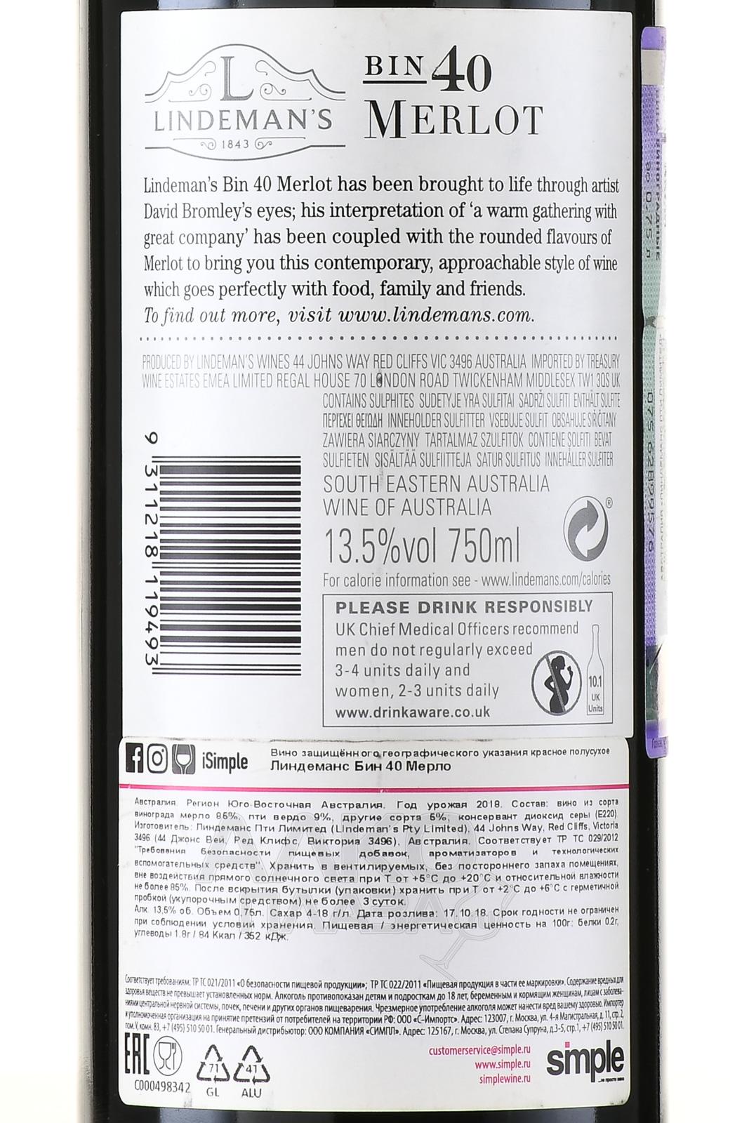 Красное сухое вино Lindeman`s Bin 40 Merlot 0,75 л производится в Южной Австралии, известном своими разнообразными климатическими условиями и плодородными почвами. Виноградники, расположенные в этом регионе, получают достаточное количество солнечного света, что способствует равномерному созреванию ягод. Основной этап винификации – ферментация в стальных резервуарах с контролем температуры. В таких условиях природная ароматика сырья сохраняется максимально. Перед бутилированием напиток выдерживается, приобретая текстурную сложность и элегантность букета.