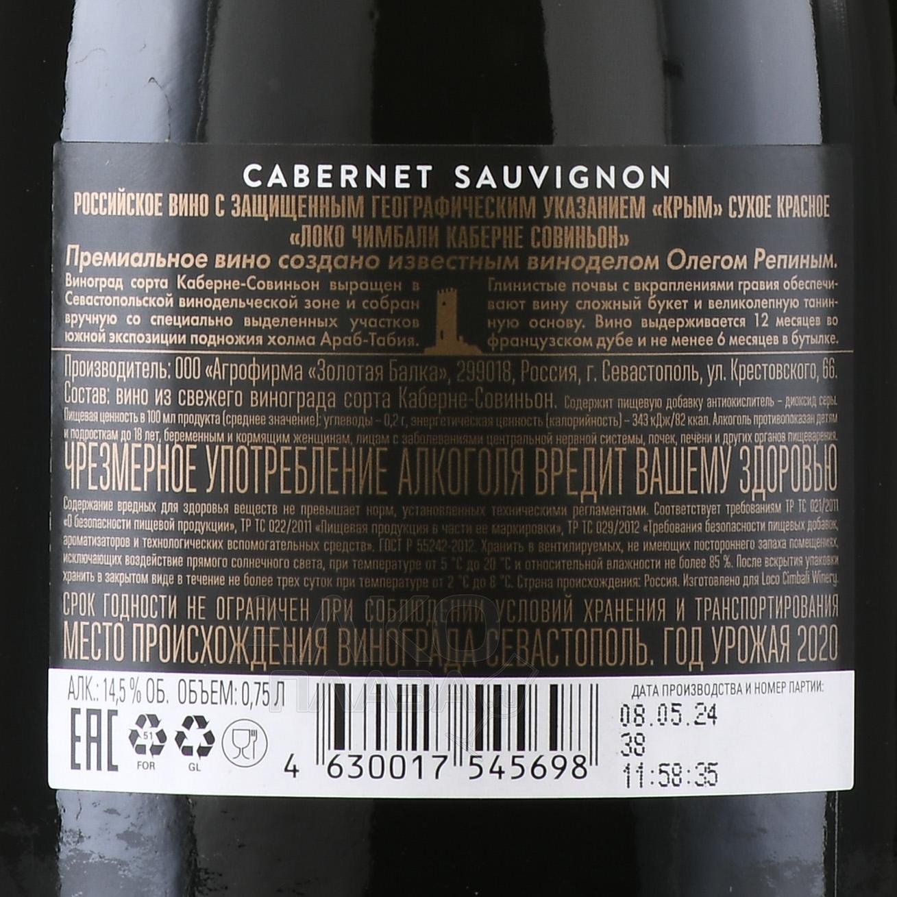 Красное сухое вино Loco Cimbali Cabernet Sauvignon 0,75 л происходит из зоны на территории Южного побережья Крыма. Виноград для создания напитка собирают с лоз, растущих на южной стороне возвышенности Араб-Табия в окрестностях Севастополя. Ягоды, сорванные вручную, в небольших ящиках переправляют на винодельню. Там их сортируют и ферментируют с контролем температуры. Одну из главных ролей в формировании богатого профиля спиртного играет продолжительная выдержка: сначала – 12 месяцев во французском дубе, после – 9 месяцев в бутылке.