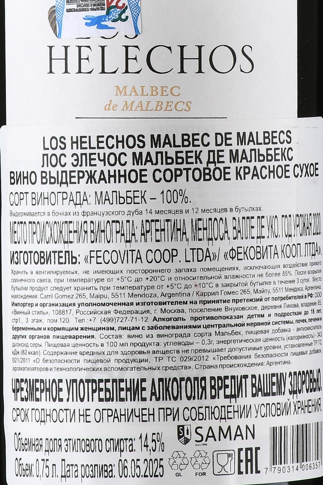 Los Helechos Malbec de Malbecs 0,75 л – красное сухое вино, созданное из флагманского аргентинского винограда. Партии ягод собирают вручную и в небольших ящиках отправляют в погреб на переработку. Пять дней плоды мацерируются на кожице при 5 °С, а затем 15 дней ферментируются в стальных резервуарах. Процесс брожения сопровождается ежедневным делестажем, когда часть сусла откачивается, насыщается кислородом и возвращается обратно в емкости. Далее в течение шести дней следует постферментационная мацерация, а после – 14-месячная выдержка в новых дубовых бочках.
