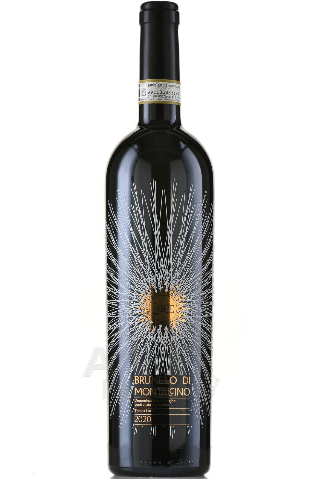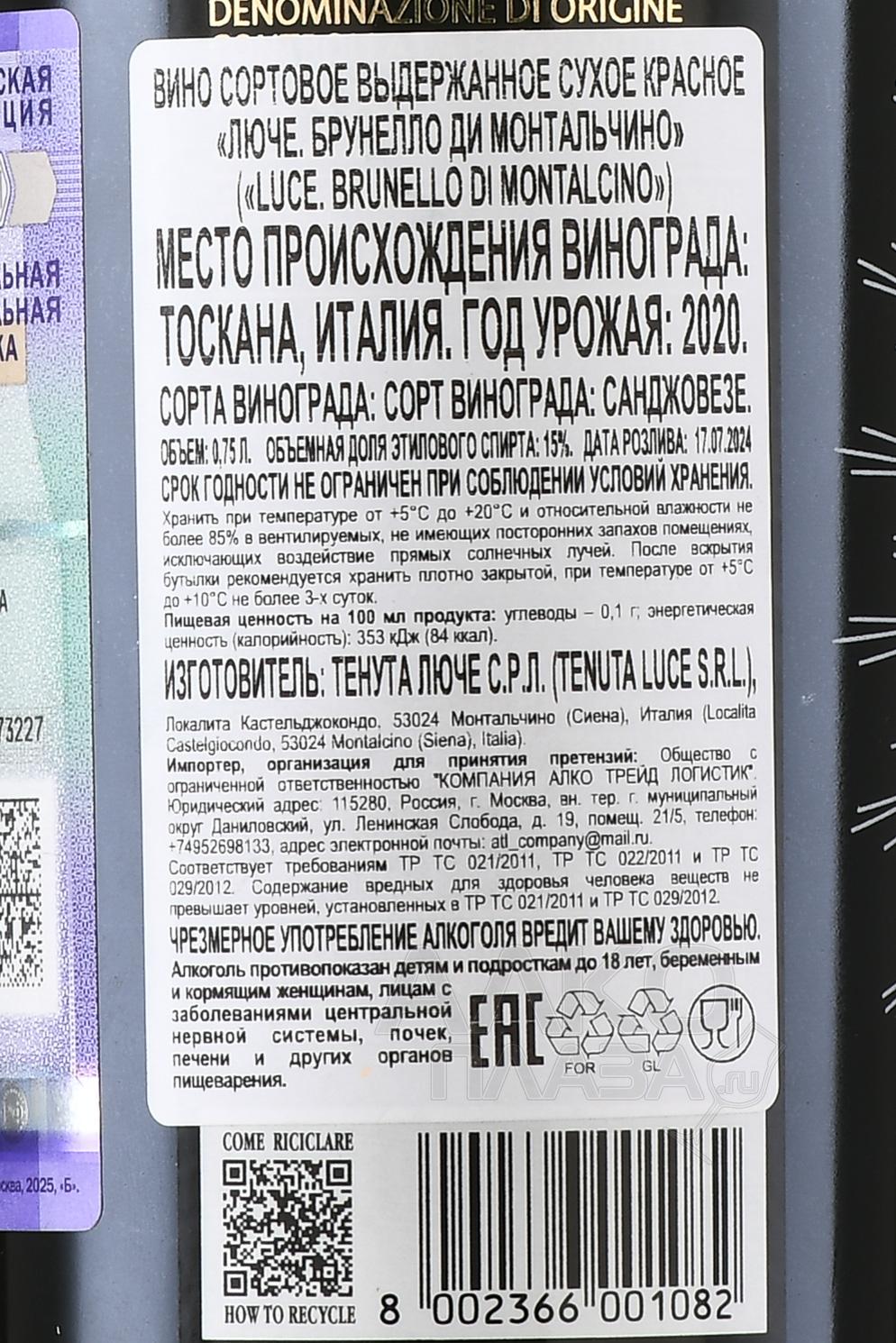 Красное сухое вино Luce Brunello di Montalcino 0,75 л — моносортовой напиток категории DOCG, созданный как дань историческому стилю Брунелло, сформировавшемуся в Монтальчино во второй половине XIX века. Виноград Санджовезе для винификации собрали с собственных участков хозяйства, из которых 11 гектаров официально зарегистрированы в Albo del Brunello di Montalcino. Лозы растут на холмах с каменисто-глинистыми почвами и галестро, где сочетание экспозиции и климата формирует концентрированное сырьё. Ферментация проходила в бетонных ёмкостях при температуре около 26 °С и длилась десять дней. Контакт с кожицей продолжался примерно четыре недели, а выдержка заняла не менее 24 месяцев в больших бочках из славонского дуба.