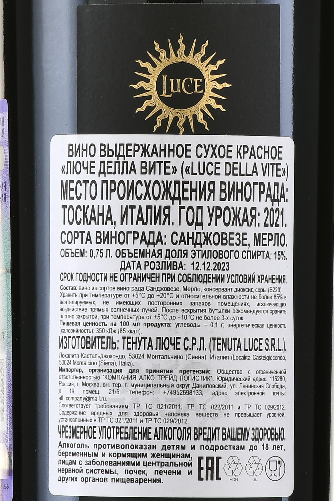 Красное сухое вино Luce della Vite относится к классу IGT. Его родиной является итальянская коммуна Монтальчино в регионе Toscana, где осуществились сбор урожая и все стадии обработки, а также бутилирование. Винтаж состоит из ягод Sangiovese и Merlot, прошедших стадии мацерации, ферментации при постоянной температуре 30 °C и выдержки сроком 24 месяцев в дубовых бочонках (первого и вторичного применения). Уровень спиртуозности вина равен 15%. Продукт реализуется в бутылках из затемненного прочного стекла, помещенных в сувенирные деревянные ящички с гравировками.