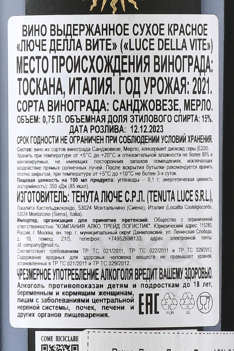 Красное сухое вино Luce della Vite — премиальный итальянский напиток защищенного географического наименования, крепость которого составляет 14,5 градуса. Его изготовили из двух сортов винограда с плантаций тосканской области Монтальчино. Сырье подверглось мацерации на кожице сроком 4 недели, а также 12-дневному сбраживанию с термоконтролем. Продолжительное вызревание (порядка 2 лет) осуществилось в двух типах барриков — новых (85%) и ранее использованных.
