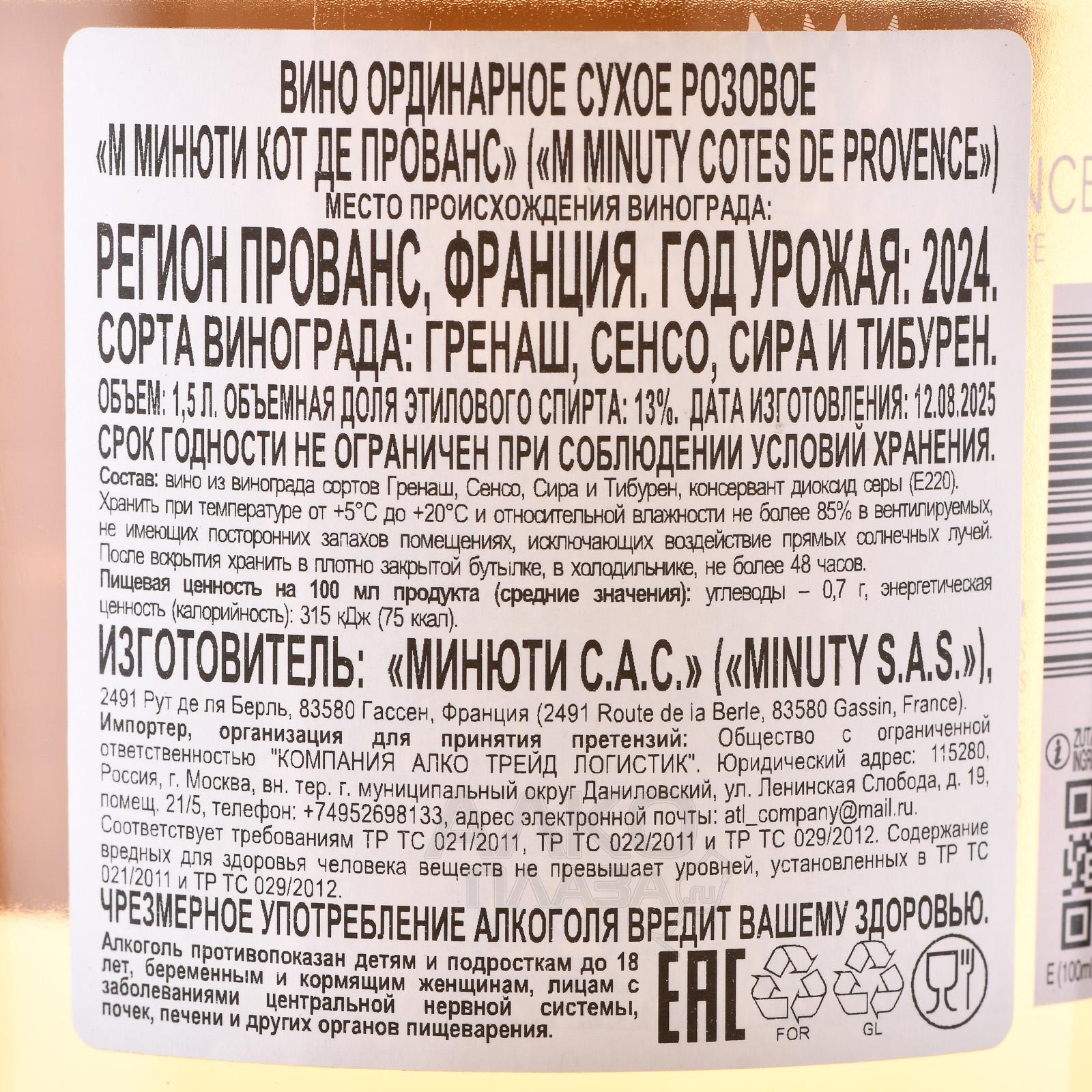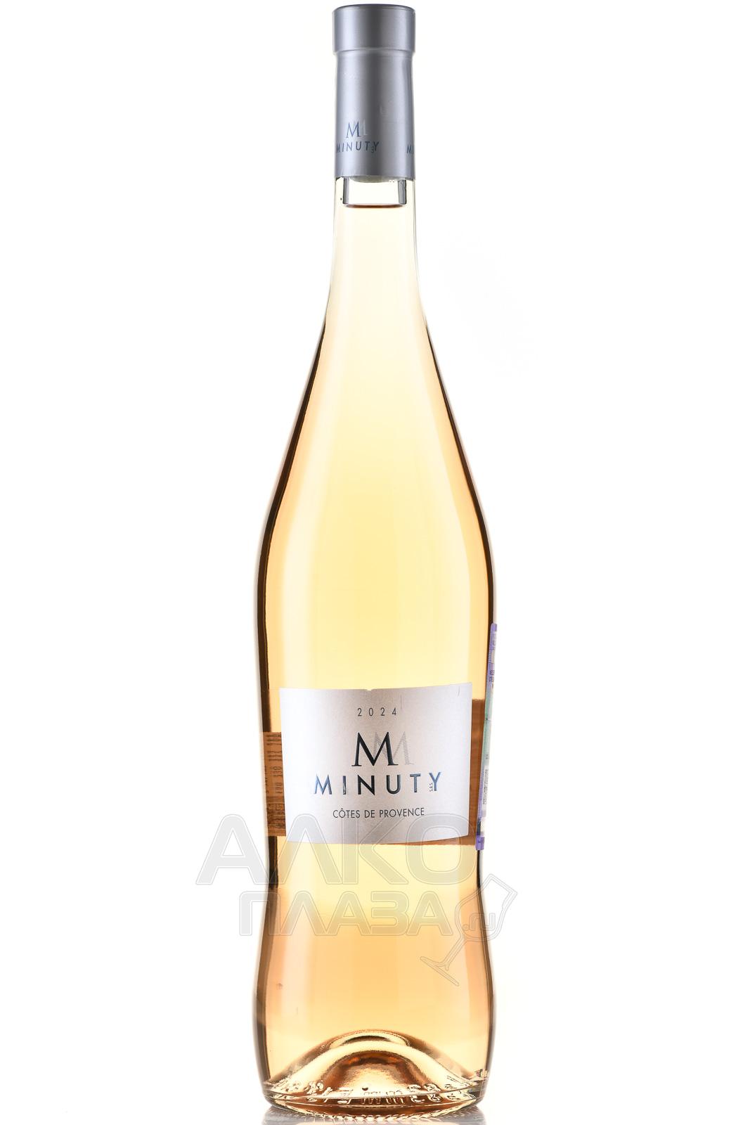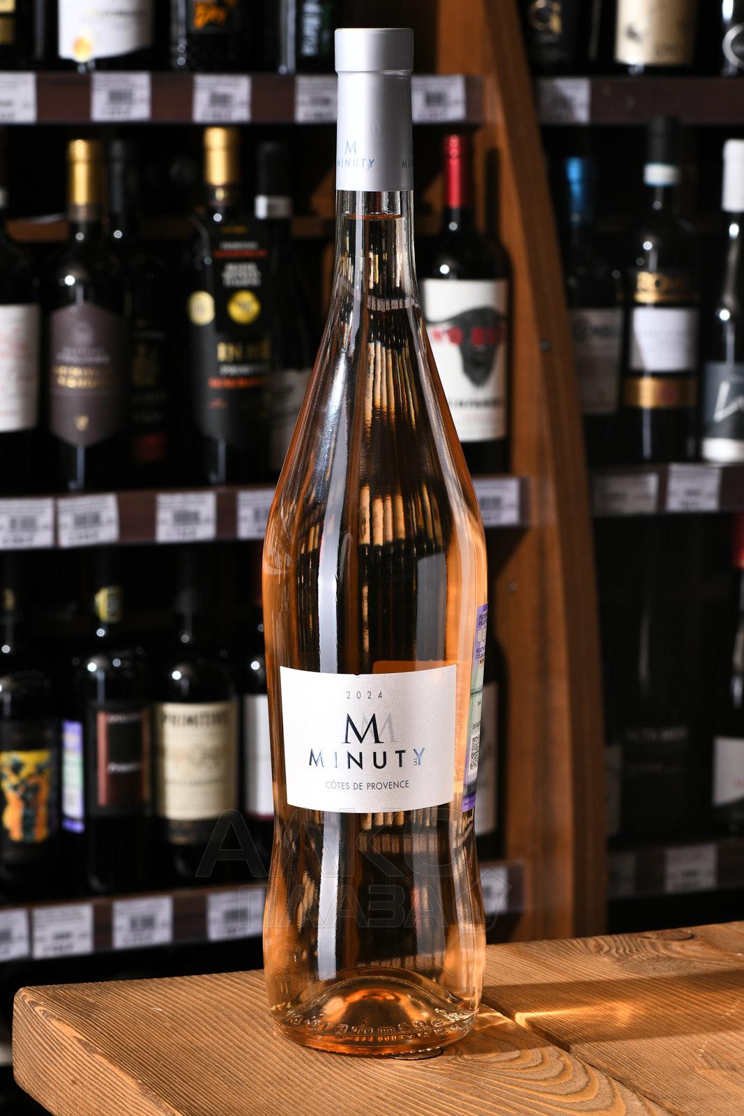 Розовое сухое вино M Minuty Cotes de Provence AOP 2021 г. — 13-градусный французский винтажный напиток защищенного географического наименования, разлитый по большим бутылкам (1500 мл), которые стоит приобрести для крупного торжества. Все этапы изготовления, в том числе сбор винограда, осуществились в апелласьоне Côtes de Provence. Ягоды прошли непродолжительную мацерацию, прессование и алкогольную ферментацию в стальных емкостях при постоянно поддерживаемой температуре 16 °C. Некоторое время вино выдерживалось в этой же таре, после чего его разлили по бутылкам.