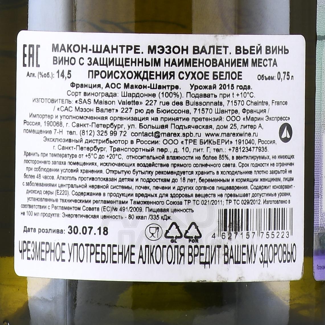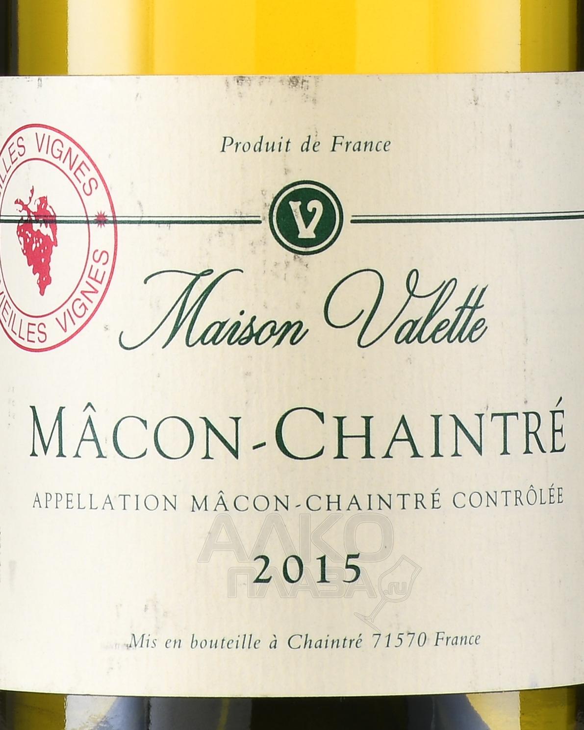 Вино Maison Valette Macon-Chaintre Vieilles Vignes AOC белое сухое 0,75 л — премиальный моносепажный сорт, который был особо отмечен критиком Робертом Паркером. Для производства используется белый виноград с южной окраины микрозоны Маконе. Здесь лозы произрастают на глинисто-известняковых и илистых почвах. Урожай получают со старых виноградников, которые были посажены более 60 лет назад. Сусло сбраживают на натуральных дрожжах. Вино около года выдерживается в дубовых бочках, которые находятся в старом прохладном погребе, а затем еще 2 года дозревает в стальных чанах. Бутилирование осуществляется без фильтрации и осветления.