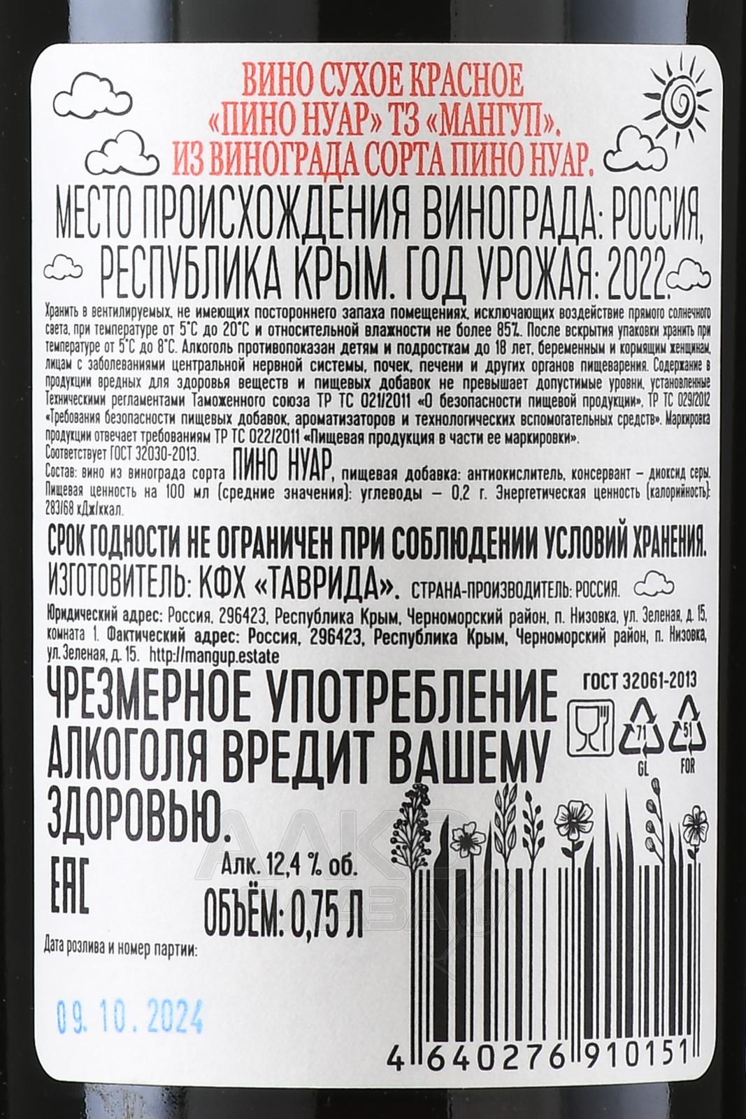 Красное сухое вино Mangup Pinot Noir 0,75 л изготовлено на винодельне полного цикла, которая владеет виноградниками и контролирует качество от и до. Сорт Пино Нуар был выращен в Бахчисарайском районе Крыма. Виноград культивируется на южном склоне Крымских гор, неподалеку от заповедника и крепости Мангуп Кале. Сбор урожая производился вручную с тщательной последующей сортировкой. Ферментация протекала в рамках классической схемы — в стали с терморегуляцией. Вино выдерживалось 8 месяцев во французских барриках. В бутылках оно будет храниться и красиво стареть 7-10 лет.