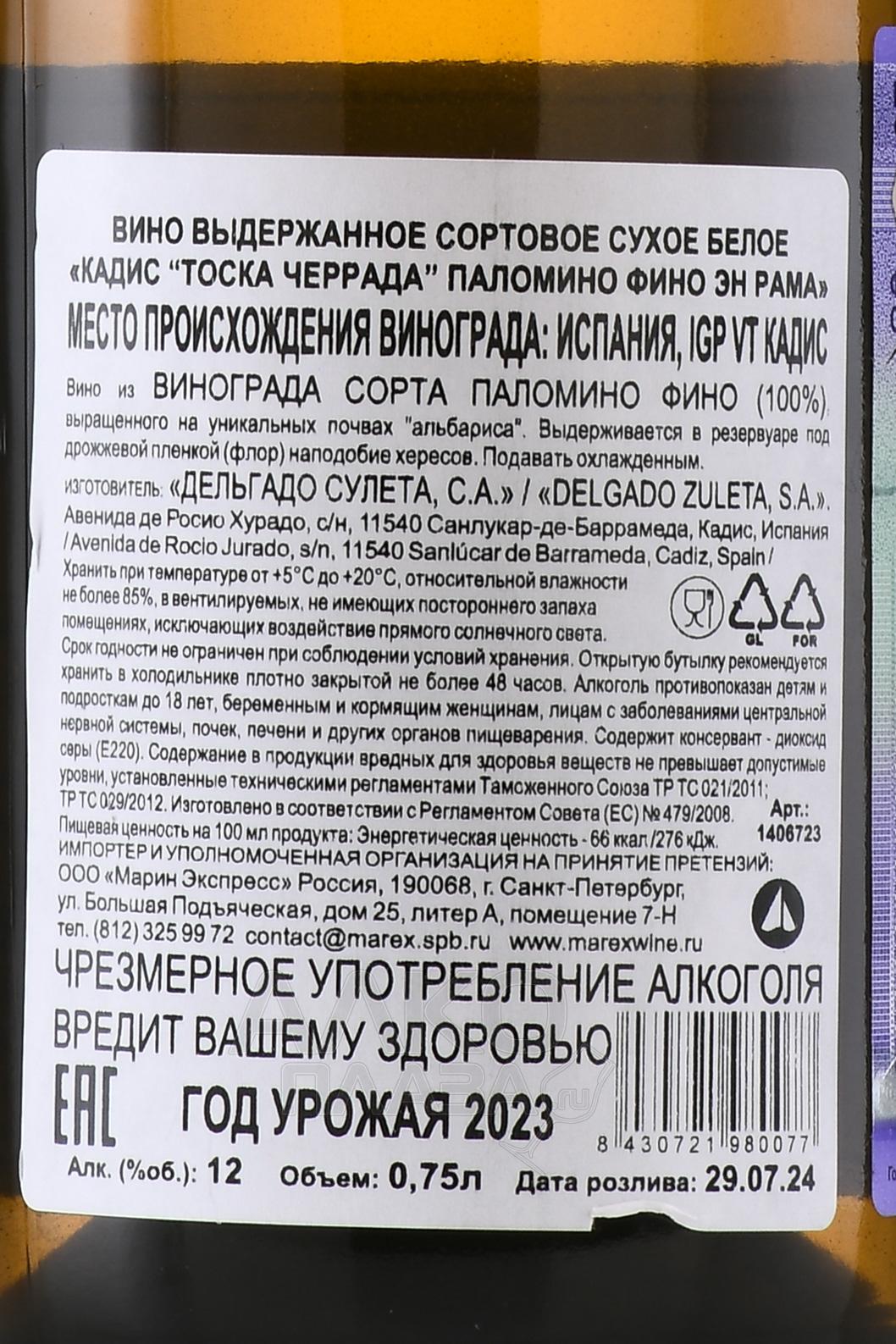 Белое сухое вино Mario Rovira Tosca Cerrada Palomino Fino En Rama 0,75 л происходит из Андалусии, из зоны Херес на юге Испании. Виноградники расположены на почвах альбариса, богатых карбонатом кальция. Эти светлые меловые грунты хорошо удерживают влагу и помогают лозе переносить жаркое лето. Ягоды Паломино здесь традиционно используют для производства напитков, выдерживаемых под флором. Плоды собирают вручную. После мягкого прессования сусло сбраживают в нейтральных ёмкостях. Далее следует выдержка дрожжевой плёнкой в бочках, выстроенных по системе солера в несколько ярусов. Обозначение en rama указывает на минимальную фильтрацию перед розливом. Такой подход сохраняет естественную структуру и подчёркивает влияние выдержки под флором.
