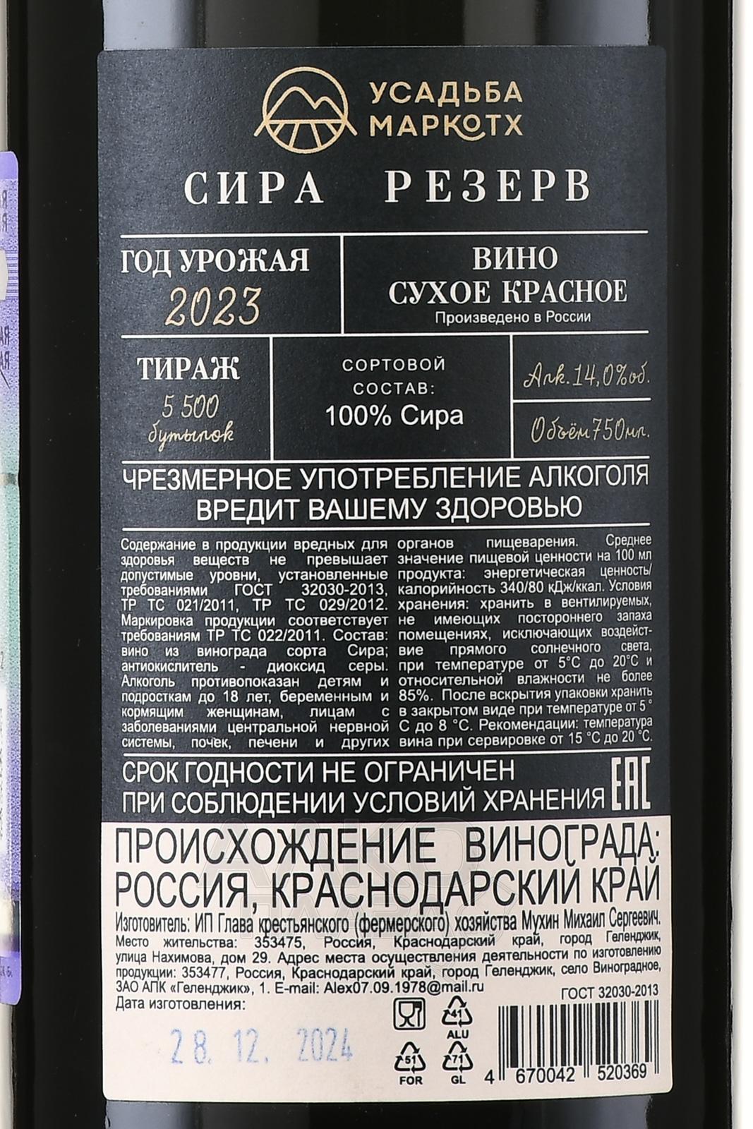 Красное сухое вино из сорта Сира произведённое виноделом Алексеем Толстым.Вино выдержанно в бочках из кавказского дуба. Цвет тёмно-рубиновый. Аромат раскрывается нотами ежевики, вишни, пряностей и подлеска. Вкус мягкий, шелковистый, с тонами спелых темных ягод и фруктов. Вино отлично сочетается с блюдами приготовленными на гриле. Подавать рекомендовано при 14-16°С.