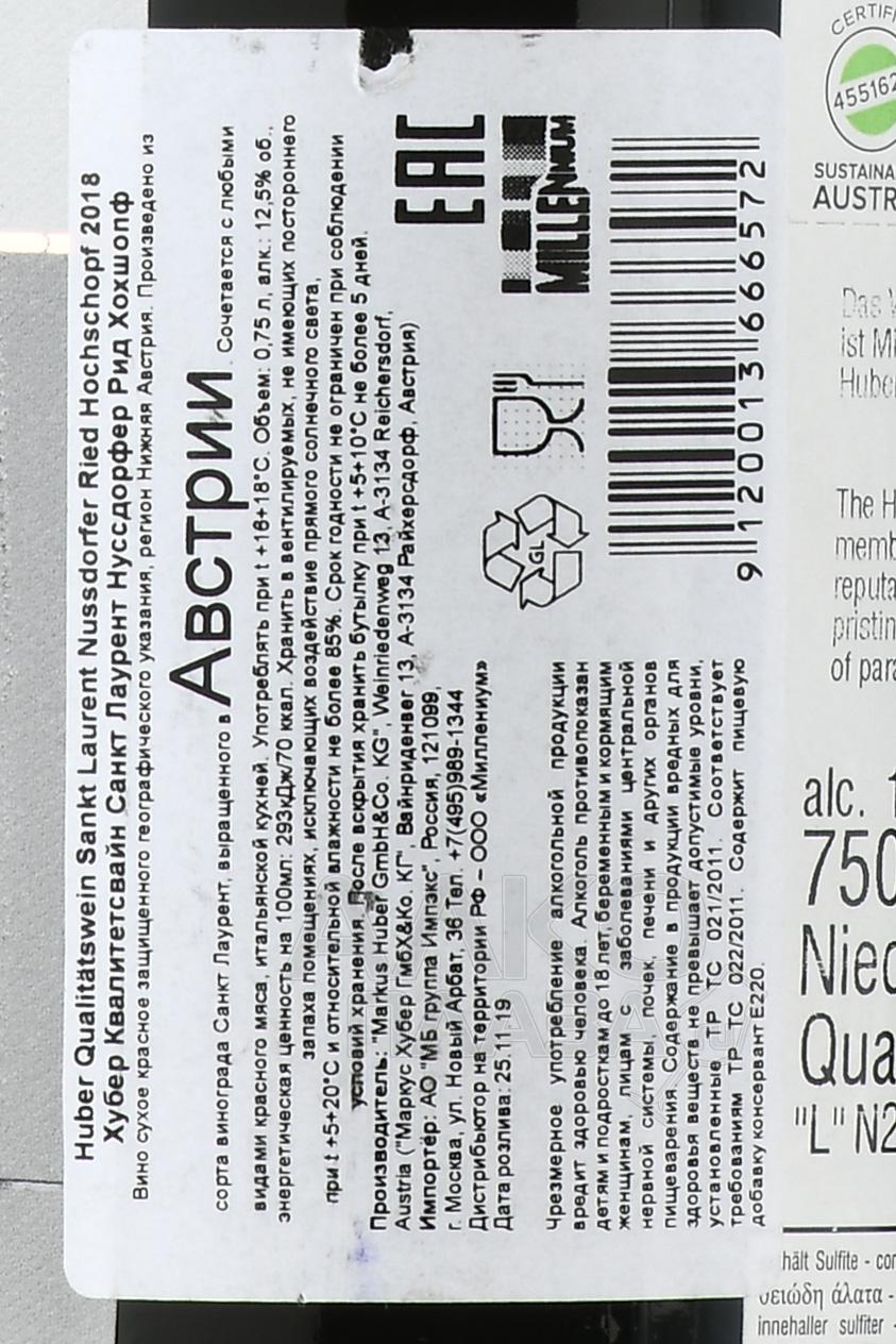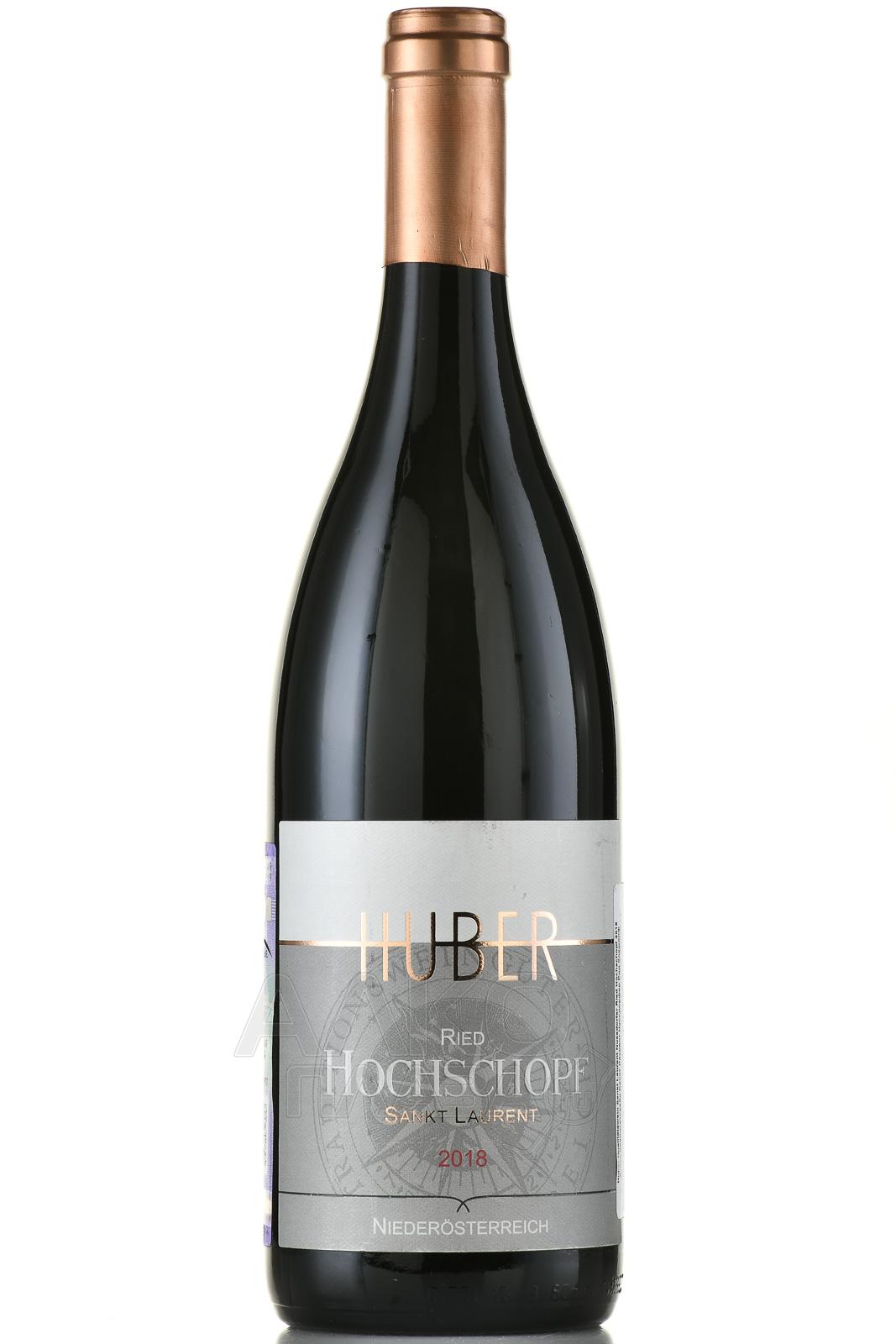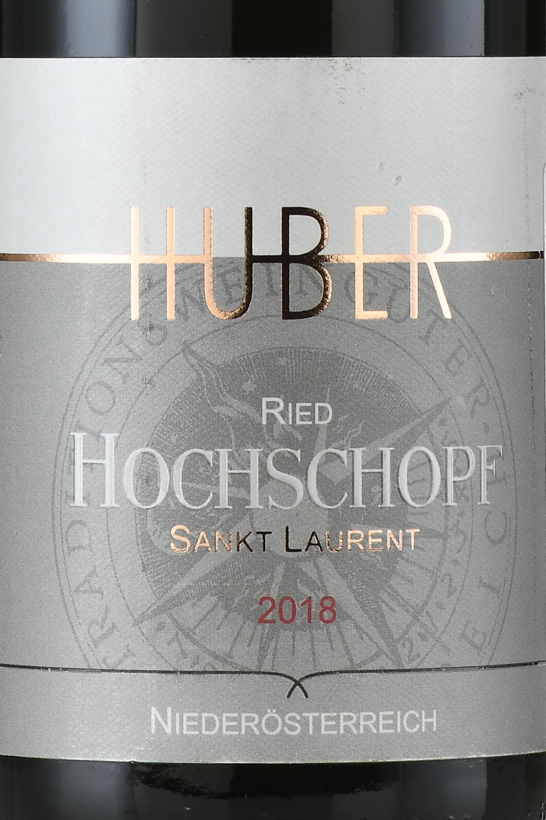 Markus Huber, Sankt Laurent Ried "Hochschopf", 2018 — высококачественное красное сухое вино с красивым ягодно-пряным ароматом и сочным вкусом с характерными сортовыми оттенками вишни и солоноватыми минеральными нюансами. Вино производится из винограда сорта Санкт Лаурент, выращенного на винограднике "Hochschopf", расположенном на высоте более 300 метров над уровнем моря с фантастическим видом на Дунай.