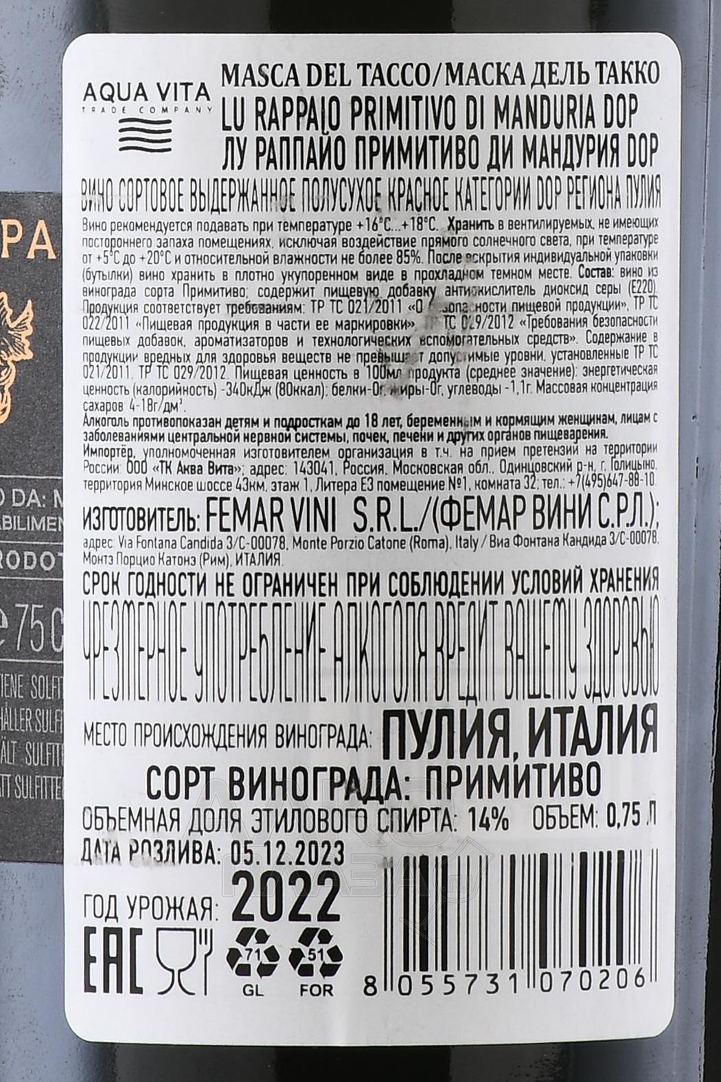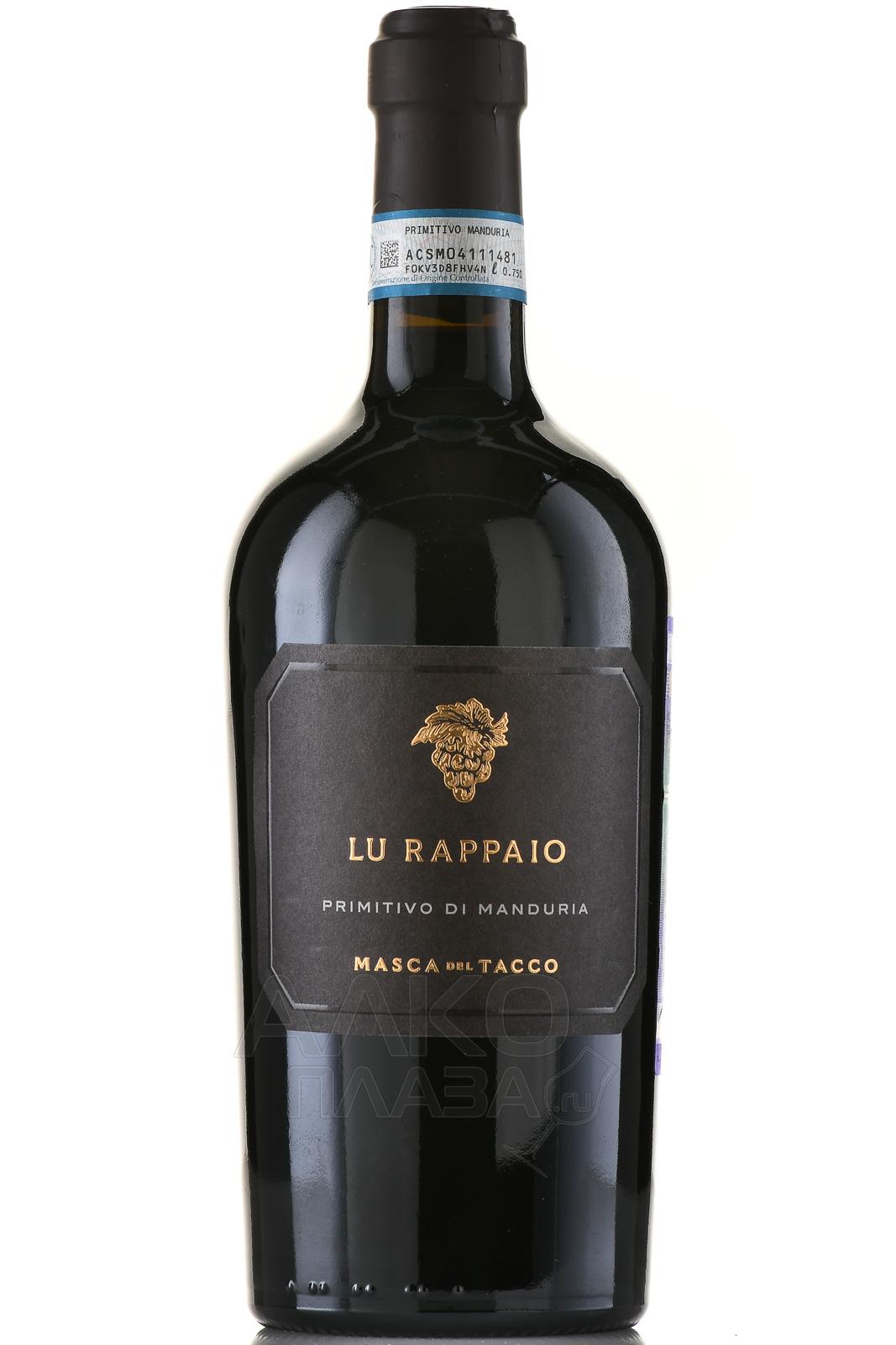 Красное полусухое вино Masca del Tacco Lu Rappaio Primitivo di Manduria 0,75 л — 14-градусная вариация итальянского происхождения, неповторимый букет которой приобрел глубину и изящество благодаря использованию в роли основы винограда региона Апулия — урожая ограниченного времени сбора. Спиртное отличается сахаристостью ниже 18 г/л, сформированной вследствие своевременной остановки контролируемого брожения сроком до одного месяца. Перед бутилированием проводились этапы выдержи сроком до полугода и фильтрации.