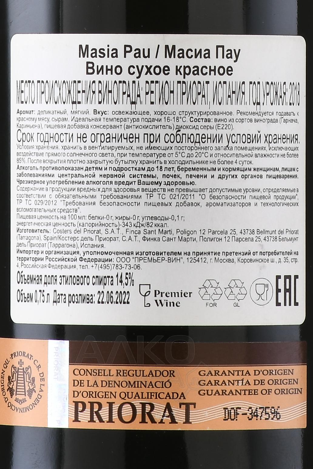 Красное сухое вино Masia Pau 0,75 л производится в Испании из местного винограда, выращенного в средиземноморском терруаре северо-востока страны. Виноградники расположены в зоне с мягкой зимой и жарким летом, где морское влияние сочетается с известняковыми и глинистыми почвами. Такие условия обеспечивают стабильное созревание ягод и сохранение естественной кислотности. Сырьё собирают после достижения фенольной зрелости. Ферментация проходит в стальных ёмкостях с температурным контролем, что позволяет сохранить сортовой характер и чистоту вкуса. Выдержка в дубе производителем не заявлена — напиток рассчитан на повседневное употребление и подачу без длительного хранения.