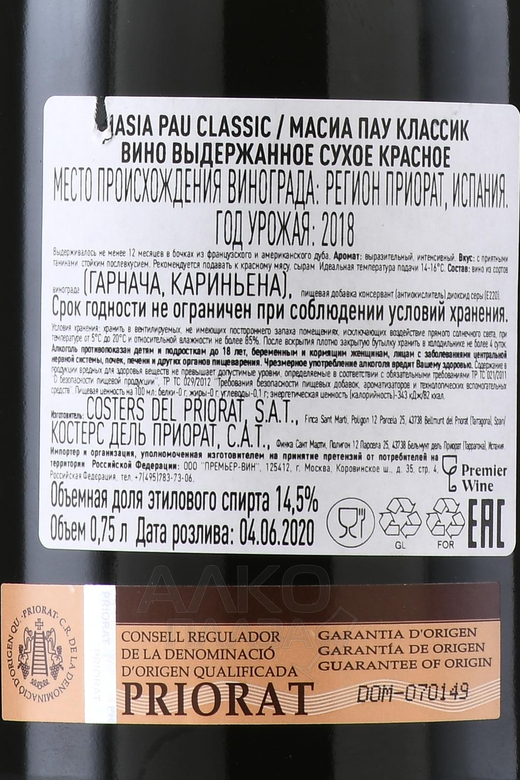 Красное сухое вино Masia Pau Classic 0,75 л производится в регионе Приорат. Виноградники здесь расположены в зоне с жарким климатом и значительными суточными перепадами температур. Почвы представлены сланцевыми породами, известными как llicorella, которые бедны органикой, хорошо дренируются и ограничивают урожайность, усиливая концентрацию ягод. Такое сочетание природных факторов формирует структурный и насыщенный стиль напитка. Сбор сырья проводят после достижения оптимальной зрелости. Ферментация осуществляется в нейтральных ёмкостях с контролем температуры.