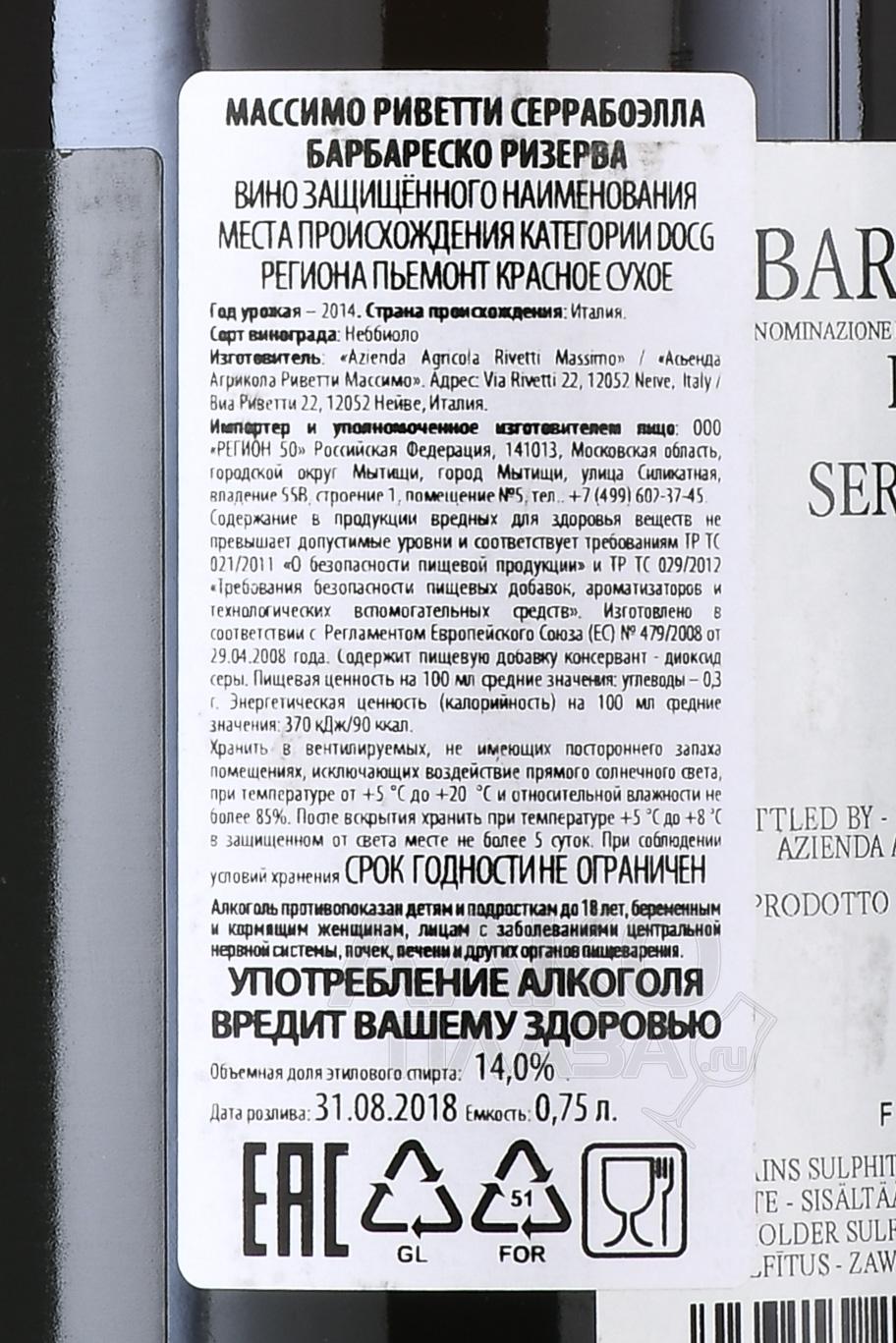 Massimo Rivetti Barbaresco Serraboella DOCG - вино Массимо Риветти Серрабоэлла Барбареско 0.75 л красное сухое