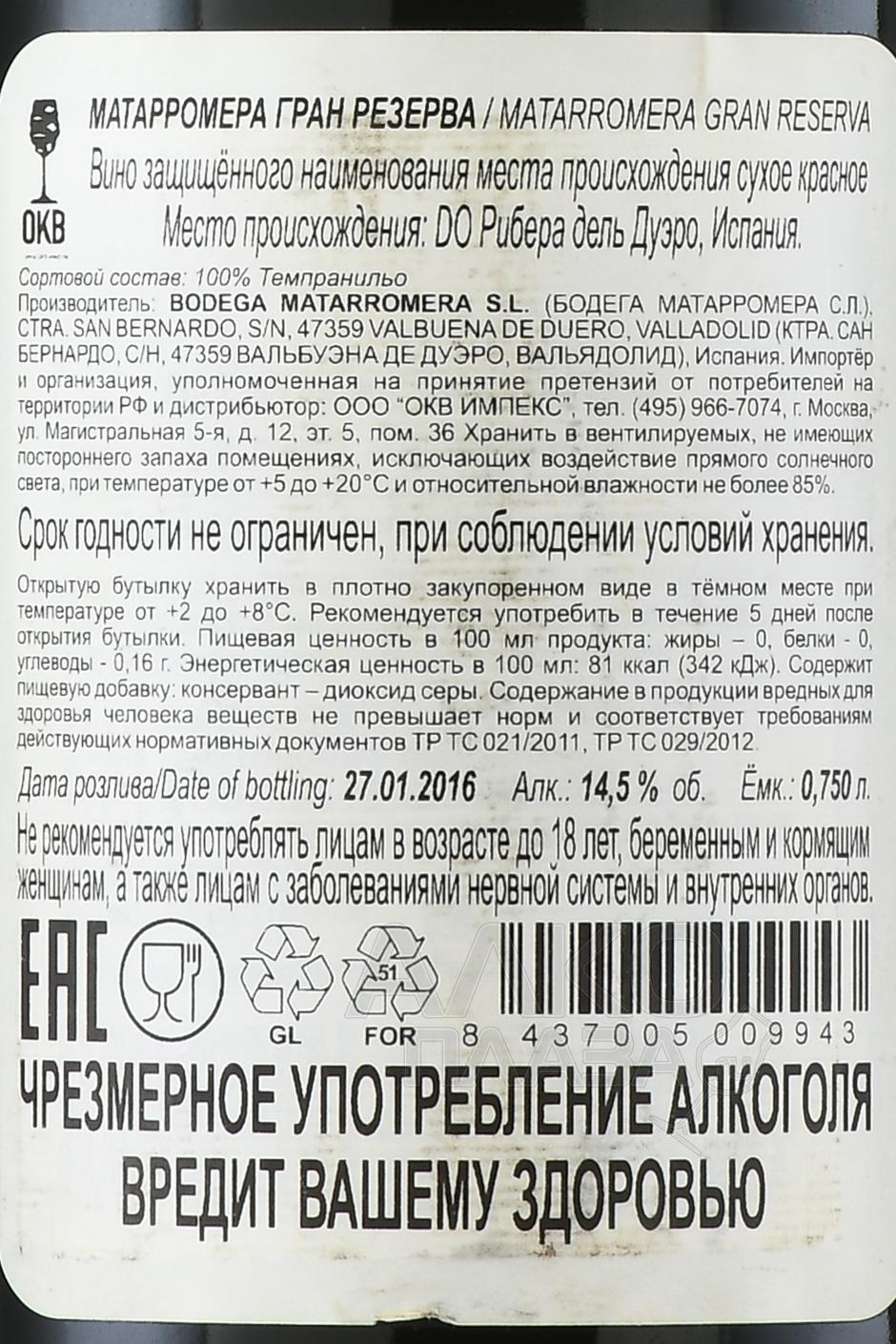 Красное сухое вино Matarromera Gran Reserva Ribera del Duero DO 2013 года 0.75 л — выдержанное, классическое, отражающее строгий и благородный характер апелласьона Рибера дель-Дуэро. Оно создано было выпущено ограниченным тиражом и ориентировано на длительное хранение (не менее 15 лет). Виноград Темпранильо для него выращивается на отдельных участках с южной экспозицией на высоте около 800 метров над уровнем моря. Климат здесь континентальный, с жарким днём и прохладными ночами, что способствует сохранению кислотности и концентрации. Урожай 2013 года собирали в начале октября. Год был непростым, но сухая осень позволила получить здоровый виноград хорошего уровня спелости. Двухнедельная ферментация проходила в стальных чанах при контролируемой температуре около 28 °C. Затем вино выдерживалось 24 месяца в бочках из американского и французского дуба. После розлива оно дополнительно созревало в бутылке не менее трёх лет.