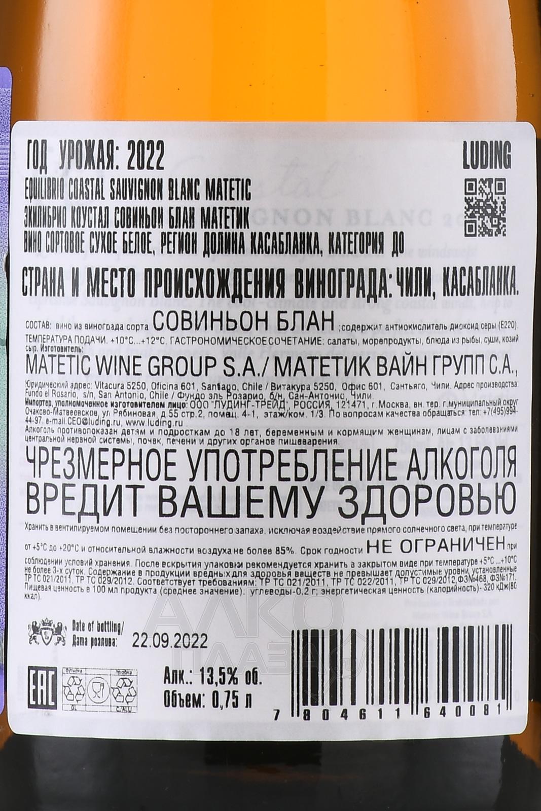 Белое сухое вино Matetic EQ Coastal Sauvignon Blanc 0,75 л создано в хозяйстве, которое известно органическим и биодинамическим подходом к виноградарству. Линейка происходит от слова Equilibrium, что символизирует равновесие между природой, почвой и виноградной лозой. Напиток производится из винограда, выращенного в долине Росарио, что входит в зону Сан-Антонио на побережье Чили. Здесь сильное влияние Тихого океана, прохладные ветра и туманы формируют уникальный климат. Среднегодовая температура — 14 °C, а перепады между днем и ночью достигают 15 °C, что способствует сохранению кислотности и свежести ягод. Почвы — в основном гранитные, с вкраплениями глины и песка. Они обеспечивают лозы хорошим дренажом и минералами. Урожай собирают вручную в ночное время, чтобы сохранить ароматический потенциал. Винификация проходит в стальных емкостях при контролируемой температуре, что подчеркивает натуральную чистоту сорта и морской характер региона.