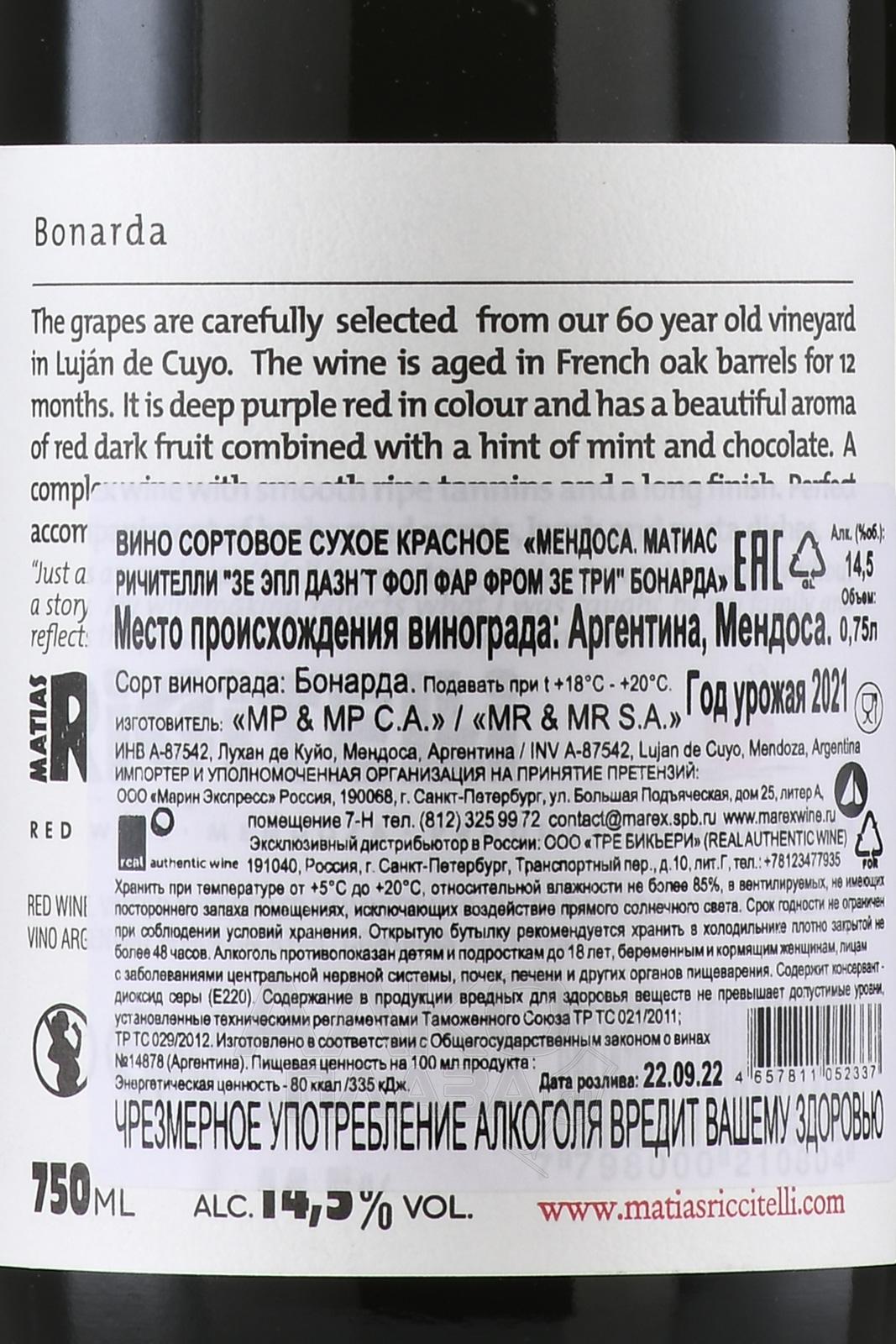 Красное сухое вино Mattias Riccitelli The Apple doesn’t fall far from the Tree Bonard 0,75 л создано в Аргентине и отражает современный стиль виноделия региона Мендоса. Виноград для этого напитка выращивается на высокогорных участках долины Уко, где лозы расположены на высоте более 1000 метров над уровнем моря. Терруар обеспечивает растениям обильное солнце днем и прохладу ночью, что позволяет ягодам сохранять кислотность и развивать сложную ароматику. Почвы здесь преимущественно аллювиальные, с высоким содержанием камня и песка, благодаря чему виноград получает хороший дренаж и концентрированный вкус. Урожай собирают вручную, чтобы сохранить целостность ягод. Винификация проводится с использованием природных дрожжей, ферментация проходит в емкостях из цемента и стали, а выдержка — в бочках, чтобы подчеркнуть чистоту сорта.
