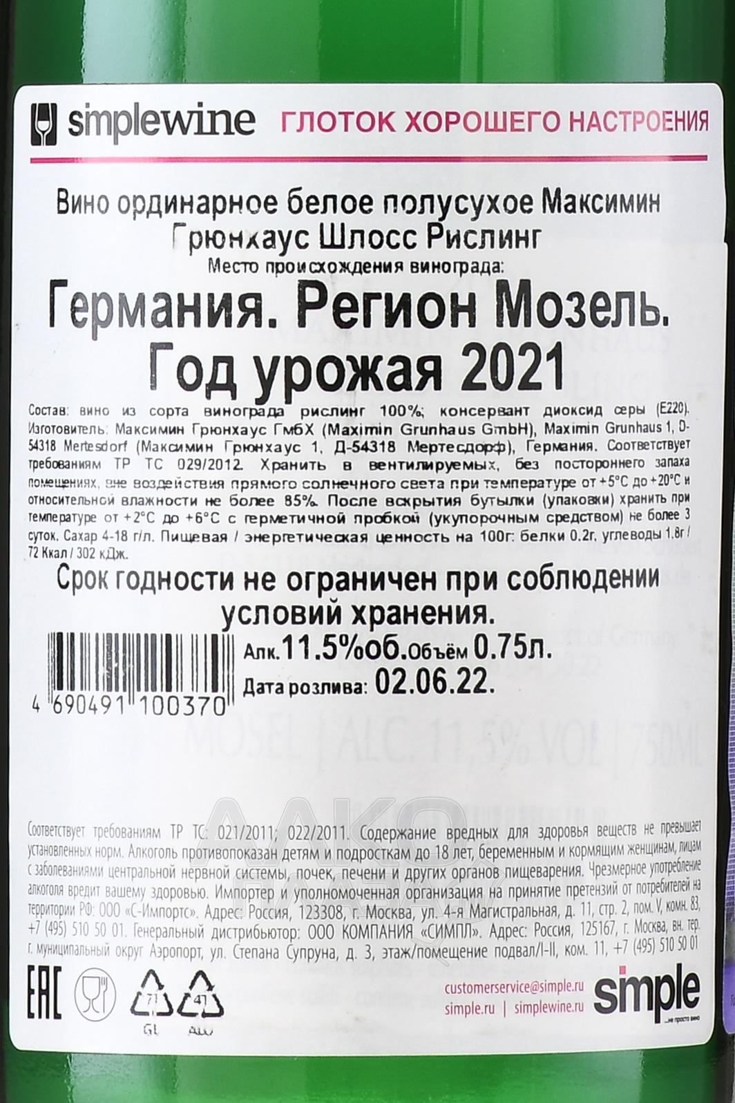Белое полусухое вино Maximin Grunhaus Riesling Monopol 0,75 л — классическая версия спиртного из известного региона Германии Мозель-Саар-Рувер, которая объединяет урожай одного года с участков близ реки Мозель. На обработку поступили только ягоды, достигшие оптимальной спелости. После деликатного отжима сусло налили в стальные баки для ферментации с постоянным термоконтролем. Выдержка длилась не больше нескольких месяцев.