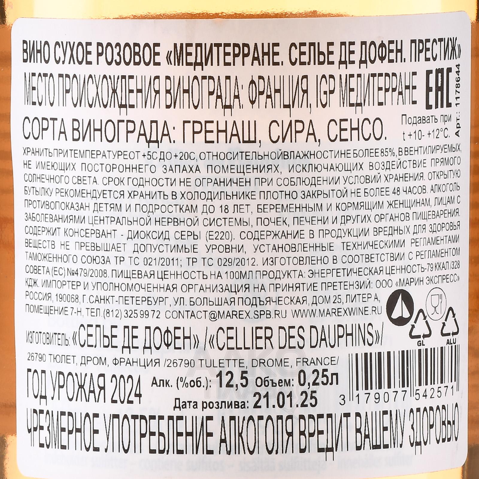 Розовое сухое вино Mediterranee Cellier des Dauphins Prestige 0,25 л — молодой напиток на основе винограда трех вариаций, который вырастили в пределах юго-восточного побережья Франции. Винификация сусла проводилась в металлических емкостях, также они послужили для недолгой выдержки вина средней спиртуозности (12,5 процента). Оно разлито по небольшим стеклянным бутылкам (в три раза меньше стандартного объема).