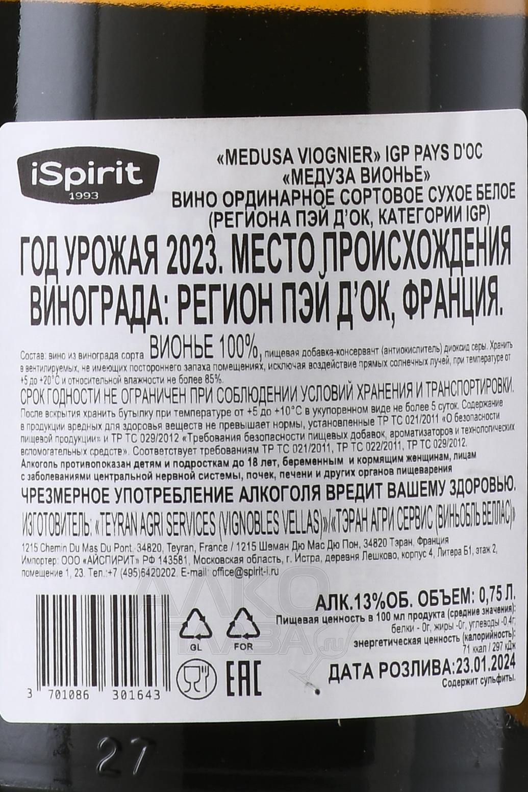 Белое сухое вино Medusa Viognier 0,75 л – лёгкий элегантный образец из Южной Франции (регион Лангедок-Руссильон, IGP Pays d`Oc). Он изготовлен из ягод созревших в терруаре с глинисто-известняковыми почвами на высоте от 200 до 400 метров над уровнем моря. В год сбора урожая климат был тёплым, с ранней весной и жарким летом. Благодаря ночной прохладе, принесённой ветром Мистраль, виноград сохранил свежесть и высокую ароматическую концентрацию. Винификация проходила при низких температурах, с предварительной холодной мацерацией для усиления фруктовых ароматов.