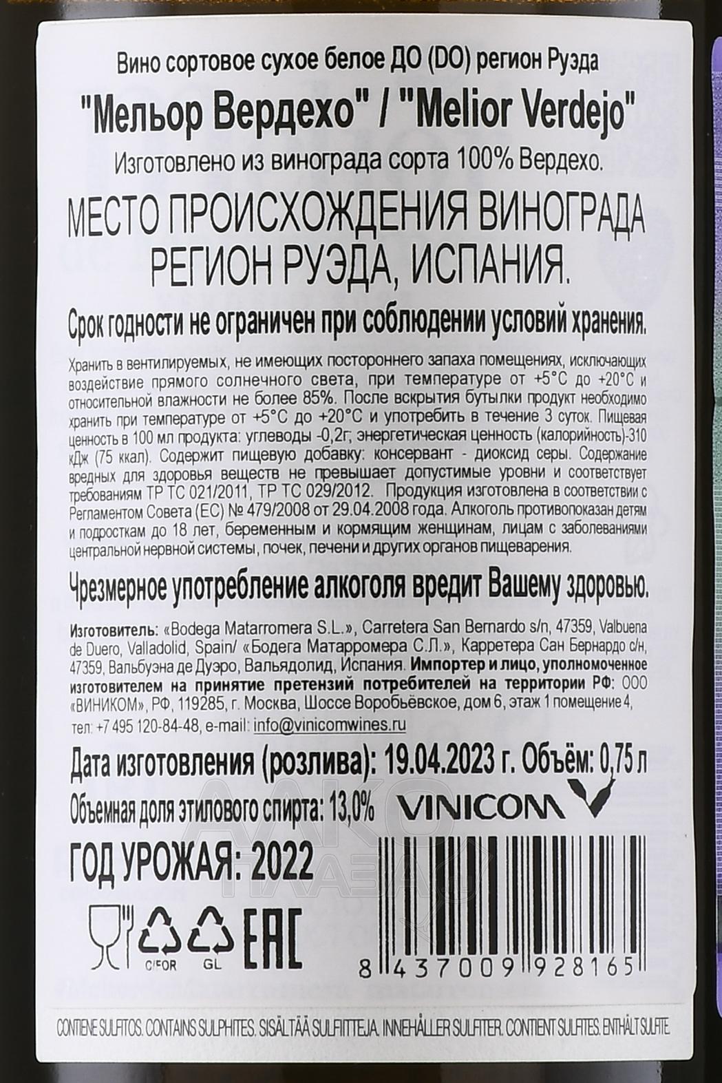 Белое сухое вино Melior Verdejo DO 2022 года 0.75 л демонстрирует черты классического стиля и ярко отражает сортовые особенности винограда Вердехо. Оно отличается свежим и чистым характером, яркой, но сдержанной ароматикой и элегантной структурой. Виноград был выращен в зоне DO Rueda, на двух участках — Finca La Monja и Finca Matalamoza, расположенных на высоте более 700 метров над уровнем моря. Терруар с континентальным климатом и выраженными суточными перепадами температур способствует сохранению кислотности и формированию насыщенного вкуса. Урожай 2022 года формировался в стабильных погодных условиях и был признан удачным. Сбор состоялся в сентябре. Ферментация длилась 14 дней при контролируемой температуре, что позволило сохранить сортовую чистоту. После этого вино выдерживалось на осадке в течение трёх месяцев. Мельор Вердехо получило золото Vinalies Internationales.