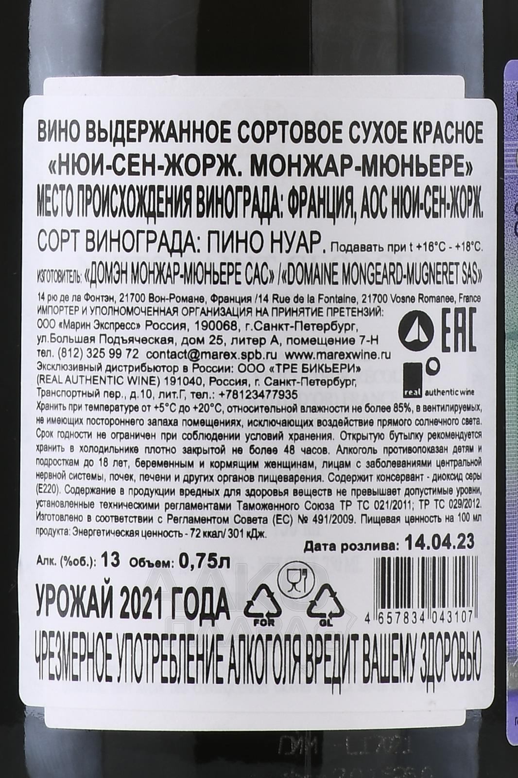 Красное сухое вино Mongeard-Mugneret Nuits-Saint-Georges 2021 года 0,75 л представляет классическую стилистику Бургундии с акцентом на изящество и глубину. Производится из сырья с 45-летних лоз. Виноград выращен на склонах Кот-де-Нюи, где почвы преимущественно каменистые и известковые. 2021 год оказался непростым из-за весенних заморозков и дождливого лета. Урожайность была низкой, зато виноград оказался отменного качества, с высокой концентрацией вкусоароматических веществ и яркой кислотностью. Ягоды аккуратно отделили от гребней. Проводилась холодная предферментационная мацерация в течение 5 дней. Ферментация проходила традиционно в стальных резервуарах с контролем температуры (не выше 30 градусов) и длилась 2 недели. Выдержка осуществлялась в дубовых бочках (примерно 30% из них новые) больше полутора лет, что придало вину гармонию и сложный букет. Бутилирование проводилось без фильтрации в апреле 2023 года. Потенциал винтажа — 5-10 лет.