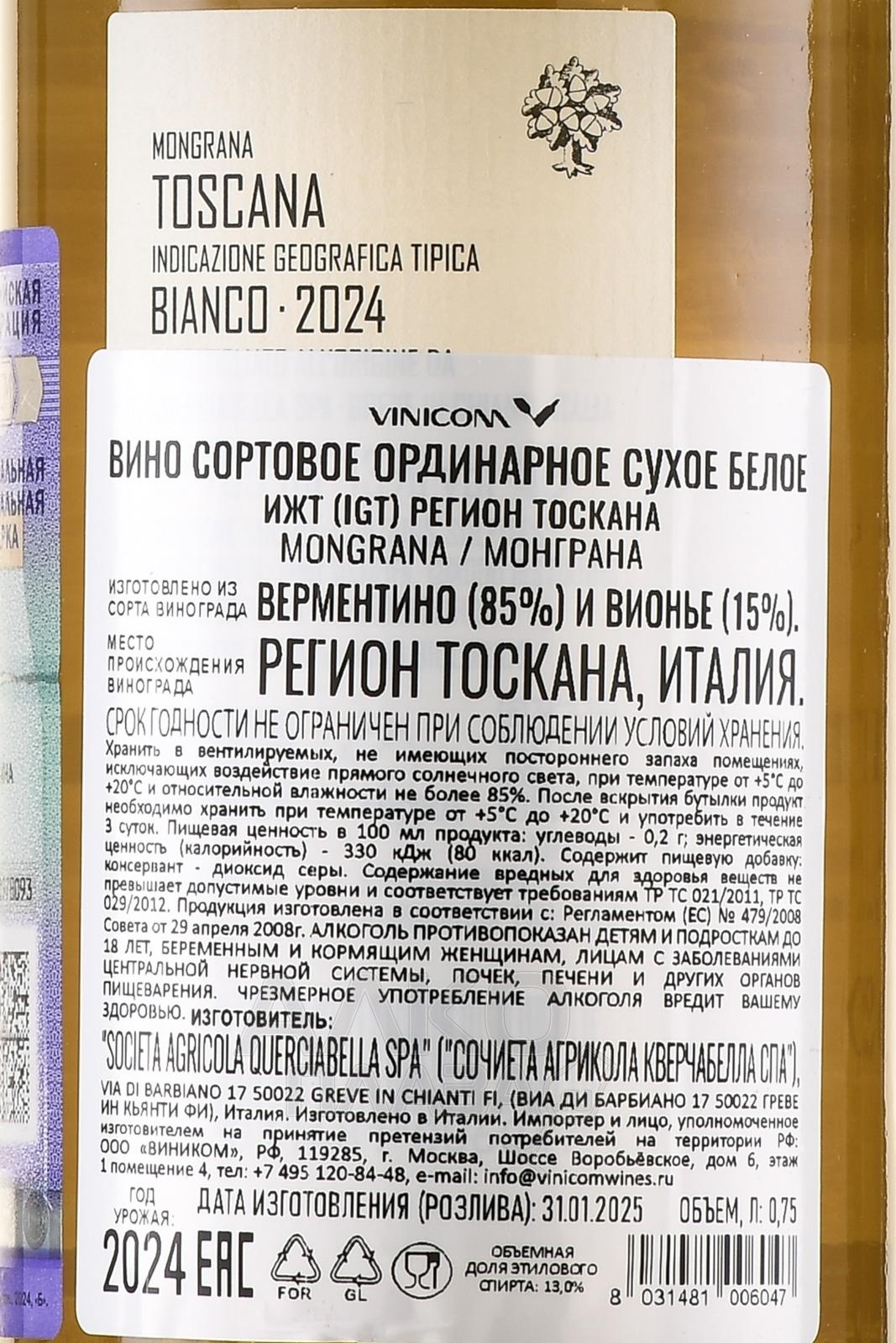 Белое сухое вино Mongrana IGT 0,75 л отражает классический характер тосканского терруара Маремма. Напиток создаётся из винограда двух сортов. Лозы растут на пологих холмах высотой от 30 до 50 метров над уровнем моря, почвы здесь богаты глиной, песком и каменистыми включениями. Климат региона характеризуется мягкой зимой и умеренно жарким летом. Урожай собирают вручную ранним утром для сохранения естественной кислотности и аромата ягод. Сусло ферментируется и выдерживается около шести месяцев в ёмкостях из нержавеющей стали и цемента без применения дубовых бочек, что сохраняет чистоту сортовых характеристик.