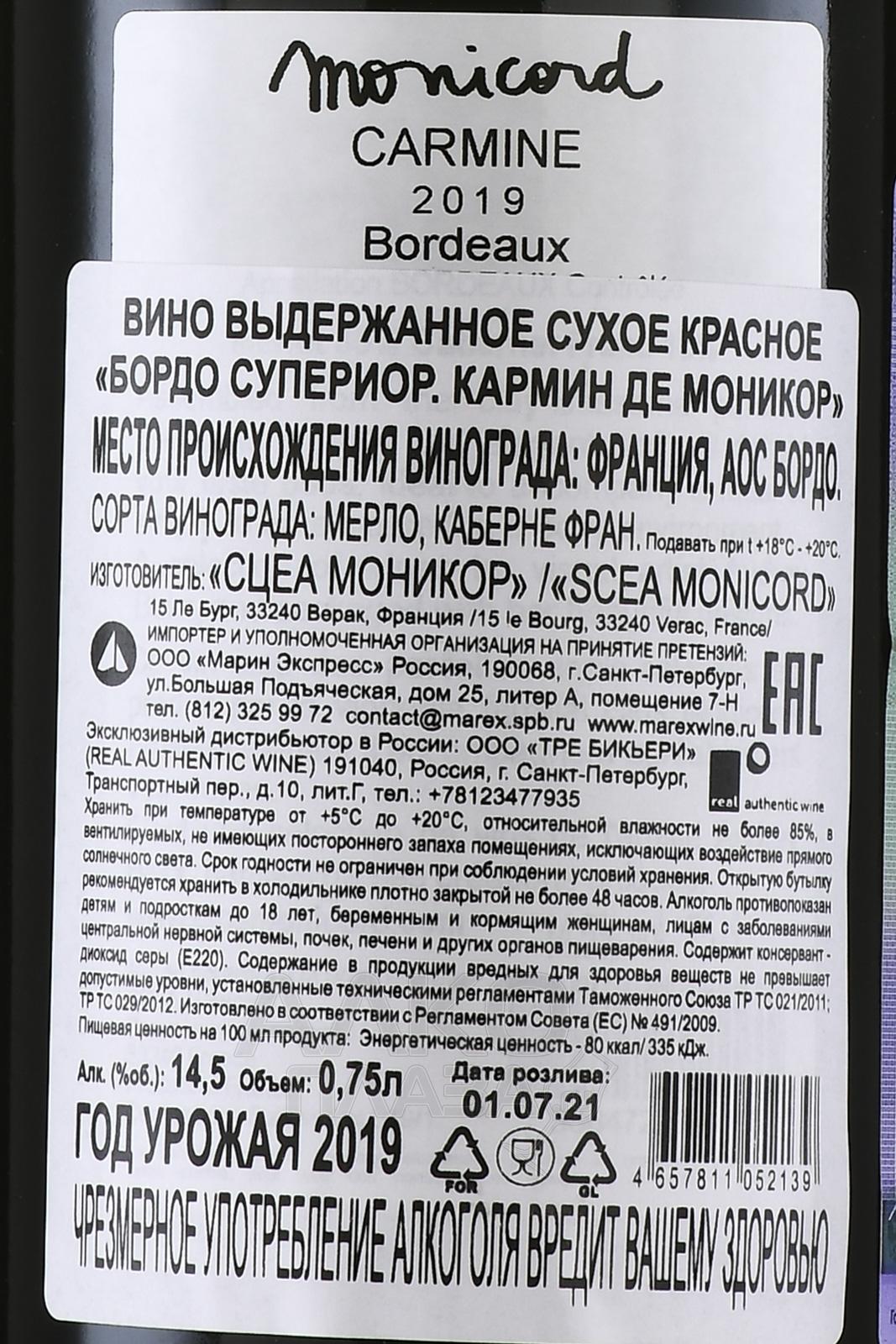 Красное сухое вино Monicord Carmine Bordeaux Superieur AOC 0,75 л происходит из семейного поместья в Бордо. Виноград здесь растет на глиняно-известняковых почвах Правого берега, рядом с известными зонами Сен-Эмильон и Фронсак. Лозы в среднем — старые, некоторые достигают возраста до 90 лет. Урожай собирают вручную, количество гроздей на растениях строго ограничивают, чтобы получить концентрированный вкус. После сбора ягоды ферментируют, а затем напиток проводит 15 месяцев в бочках из французского дуба.