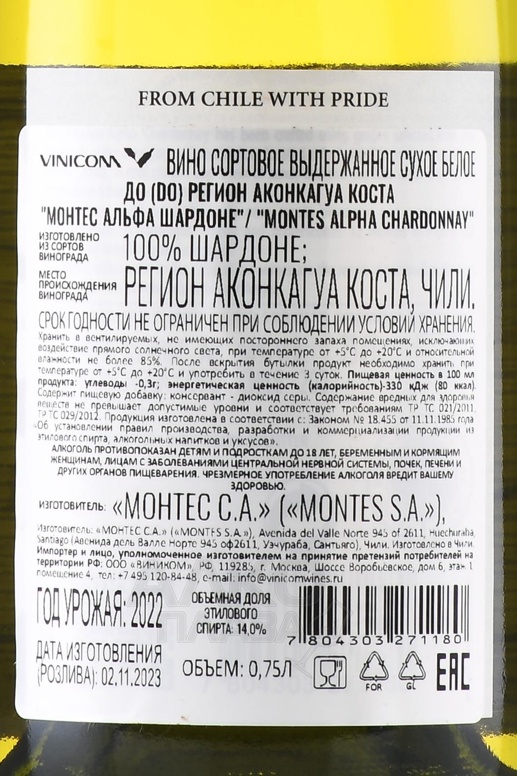 Белое сухое вино Montes Alpha Chardonnay 0,75 л числится в коллекции элитных напитков чилийской винодельни, которую организовал Аурелио Монтес в конце восьмидесятых годов XX века. Один сорт винограда, представленный в составе этого экземпляра, собрали в ранние утренние часы на просторах Долины Аконкагуа. Прессование сырья после гребнеотделения проводилось на традиционном оборудовании, затем алкоголь прошел холодную мацерацию. Перед сбраживанием муст отстаивался двое суток. Около 40% вина вызревало во французских бочках до 12 месяцев. Его рекомендуется дегустировать в течение 5 лет после розлива.