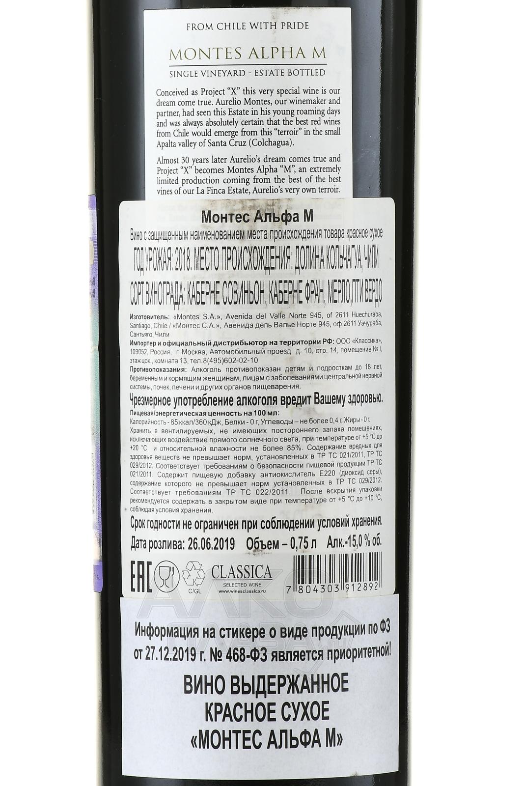 Красное сухое вино Montes Alpha M 2012 г. 0,75 л – сорт из флагманской линейки чилийского производителя. Ультрапремиальная вариация происходит с виноградников долины Кольчагуа. На винификацию пошли урожаи популярных бордоских сортов винограда, собранные в один год. В высокогорном терруаре Чили ягоды приобрели уникальную органолептику. После традиционной термоконтролируемой ферментации и мацерации напиток созревал 18 месяцев в бочках из французского дуба. Перед розливом по бокалам спиртное рекомендуется декантировать как минимум в течение часа.