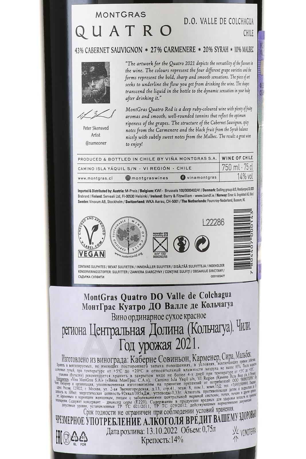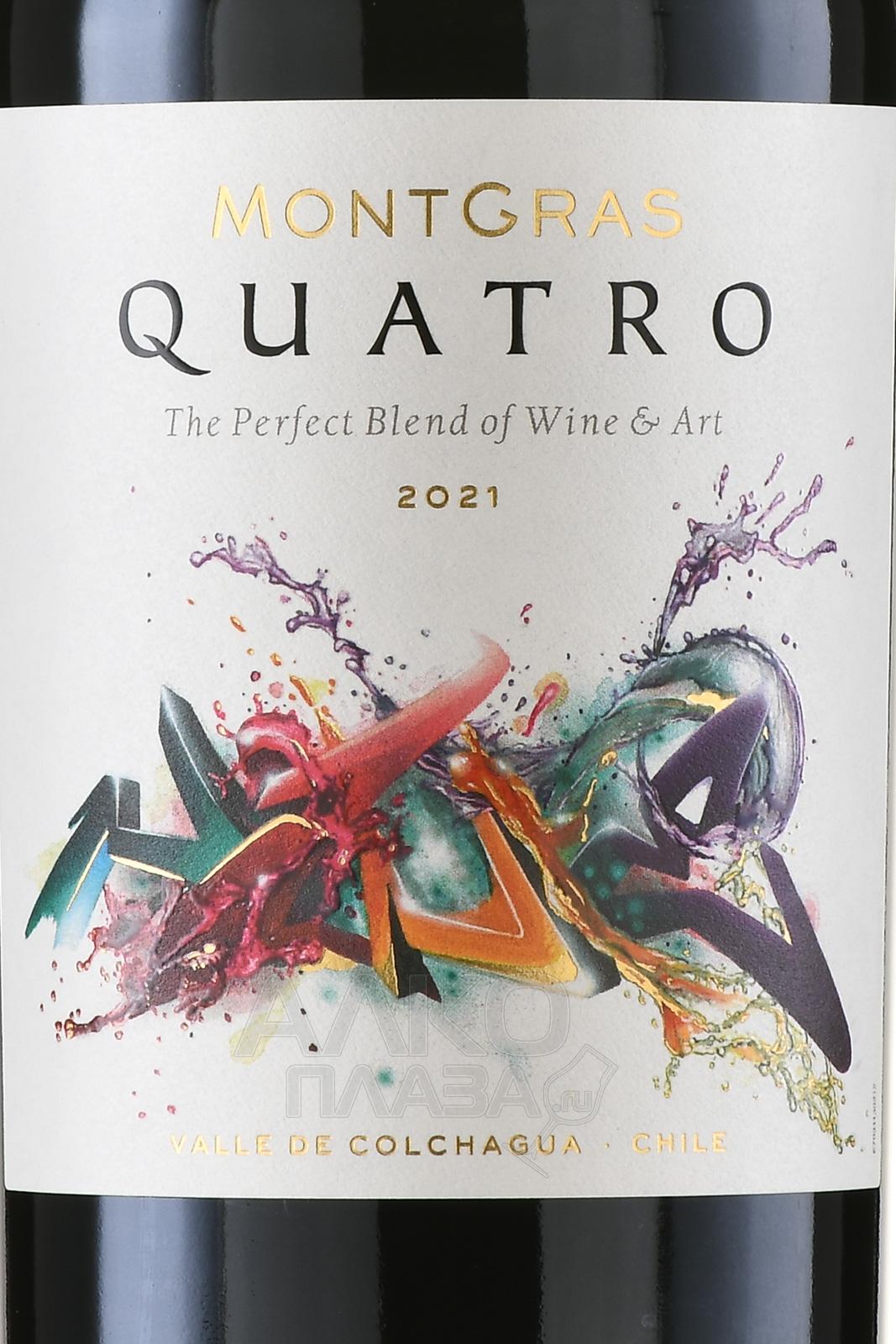 Красное сухое вино MontGras Quatro DO Valle de Colchagua 0,75 л из долины Кольчагуа создано по революционной для Чили технологии, адаптировавшей традиционные методы под современные тенденции. Купаж из 4 сортов обладает глубоким и насыщенным вкусоароматом. Сырье собирали вручную в разное время, по мере созревания каждой разновидности. Ферментация протекала в стальных резервуарах при 29-30 градусах. Вино проходило выдержку в емкостях из нержавеющей стали (20%) и дубовых бочках (80%) на протяжении 8 месяцев. Потенциал хранения в бутылке составляет 7-8 лет.