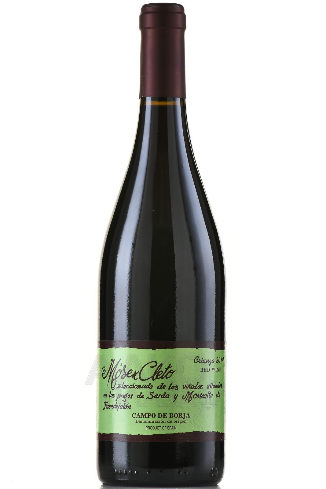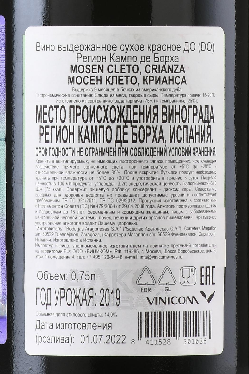 Красное сухое вино Mosen Cleto Crianza Campo de Borja DO 0,75 л характеризуется чистым сбалансированным вкусом и пряным ароматом. Оно изготовлено в Испании из двух сортов местного винограда, таких как Гарнача и Темпранильо, возраст лоз которых достигает 30 и 20 лет соответственно. Урожай собирают в первой половине сентября. Алкогольная ферментация протекает в резервуарах из нержавеющей стали, оснащенных специальной системой термоконтроля, при температуре 28 градусов. Далее сусло на протяжении двух недель мацерируют на кожице, после чего вино 10 месяцев выдерживают в бочках из древесины американского дуба, а затем еще более года в бутылках в подвалах винодельни.