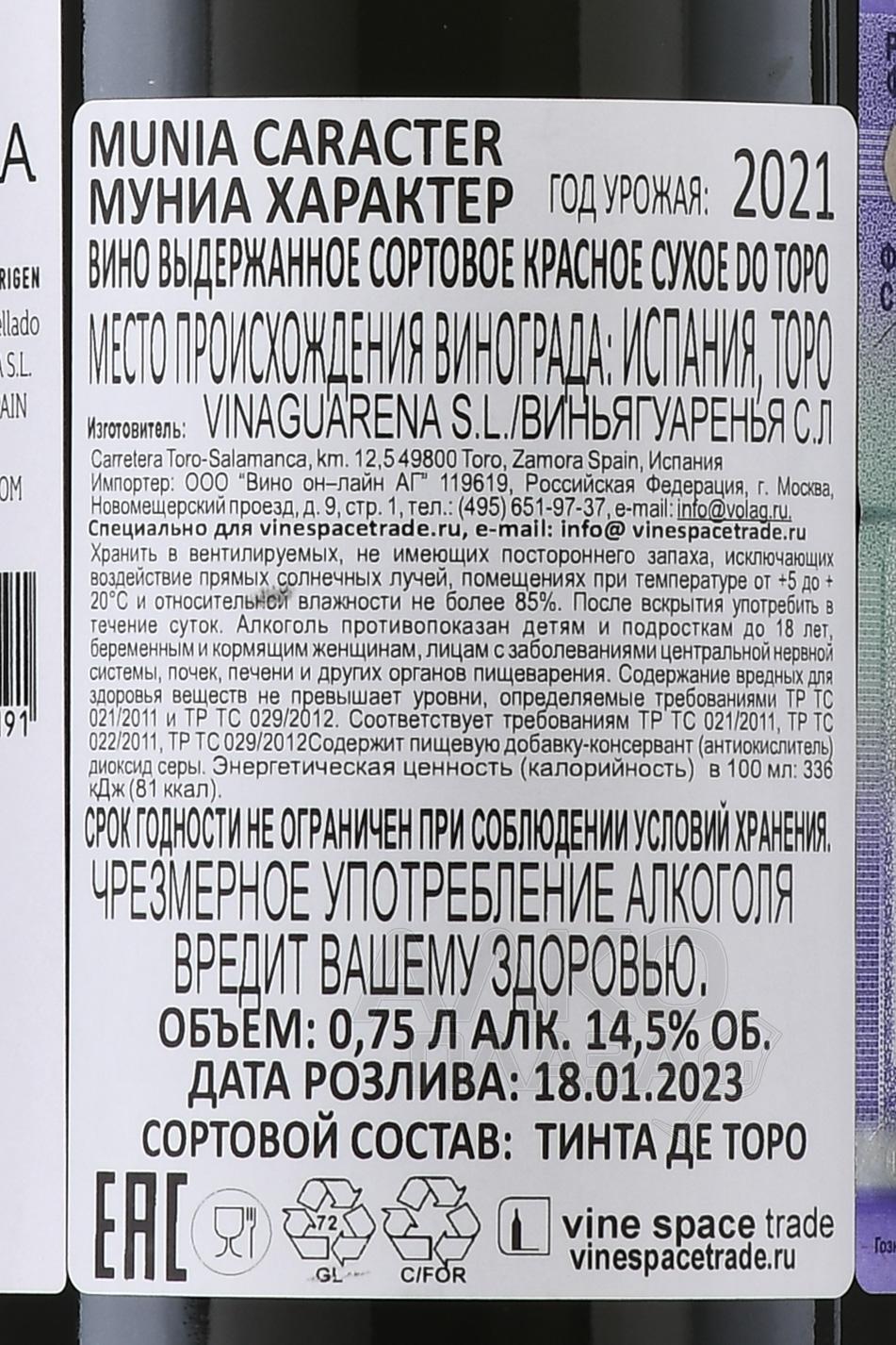 Красное сухое вино Munia Caracter Toro DO 0,75 л — элегантный напиток, рожденный на виноградниках Viña Guareña в сердце испанского региона Торо. Он произведен на 100% из винограда Tinta de Toro, сорта, адаптированного к суровому континентальному климату с жарким летом и ледяной зимой, характерному для высот 620–750 м над уровнем моря, с влажностью около 350–400 мм и солнечным светом до 3 000 часов в год. Почвы здесь песчаные и известково-глинистые — они дают насыщенность и структуру, а виноград, многие лозы которого от 30 до 50 лет, обеспечивает глубокий характер. Сусло проходит ферментацию при температуре около 24 °C, а затем выдерживается 16 месяцев в бочках из французского дуба среднего обжига.