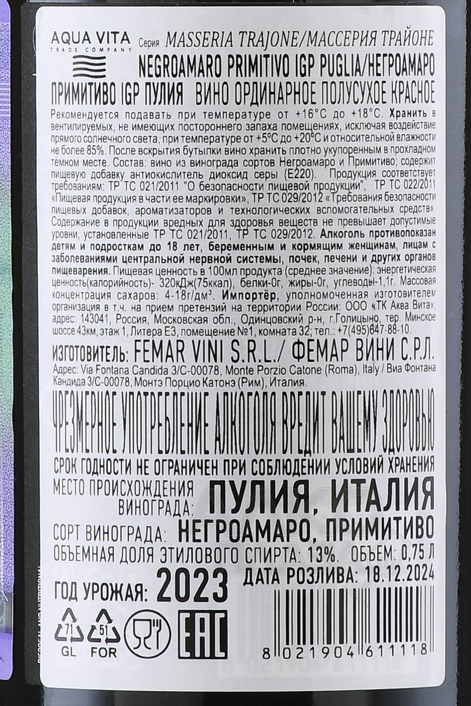 Negroamaro Primitivo Puglia IGP Masseria Trajone - вино Негроамаро Примитиво ИГП Пулия Массерия Трайоне 0.75 л красное полусухое