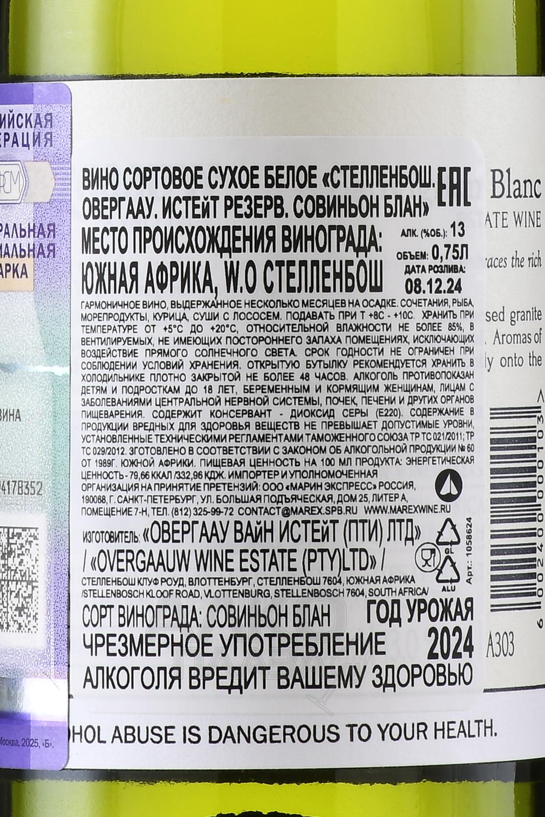 Белое сухое вино Overgaauw Estate Reserve Sauvignon Blanc 0,75 л производится в ЮАР, в регионе Стелленбош, из собственных урожаев хозяйства. Участки с лозами расположены на склонах с гранитными и выветренными почвами, которые обеспечивают хороший дренаж и умеренное питание лозы. Близость Атлантического океана и влияние прохладных морских ветров смягчают жару и способствуют сохранению кислотности. Эти условия формируют стиль с выраженной свежестью, точной ароматикой и минеральными чертами. Виноград собирают вручную в оптимальной фазе зрелости. Ферментация проходит в стальных ёмкостях при контролируемой температуре, что позволяет сохранить чистоту аромата и сортовую выразительность. Выдержка проходит в нейтральных резервуарах, подчёркивая природный профиль сырья и влияние терруара.
