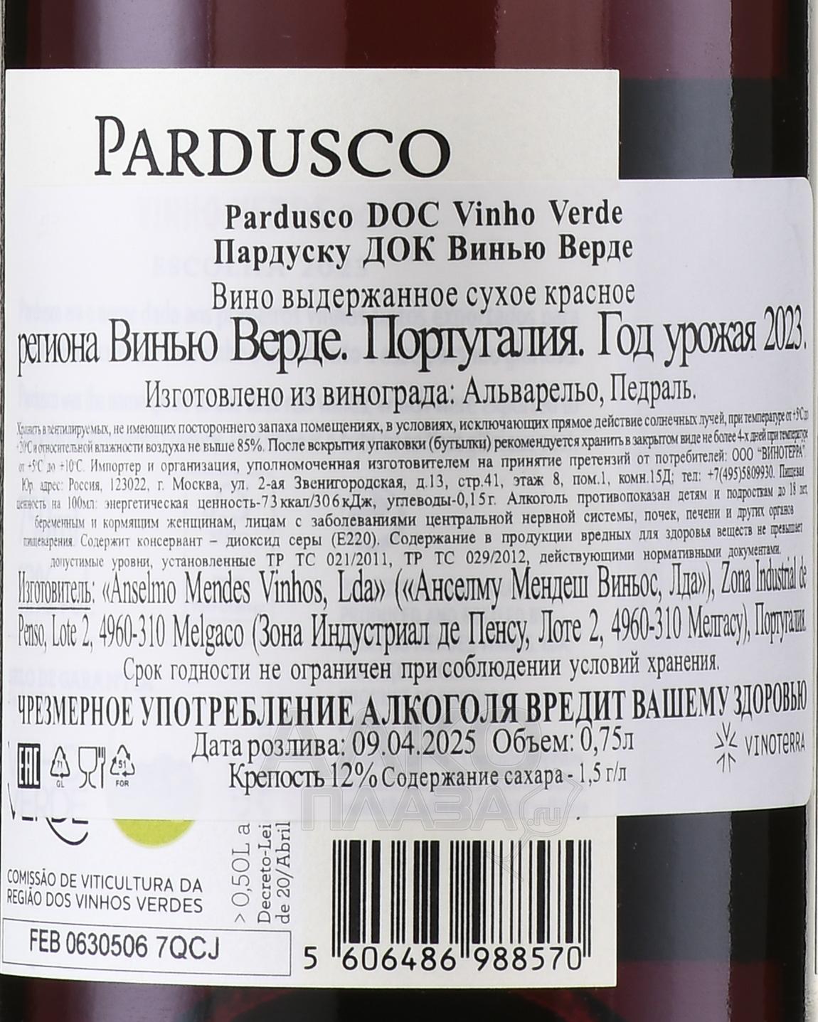 Красное сухое вино Pardusco Vinho Verde DOC 0,75 л – выдержанная и при этом питкая свежая вариация на основе португальских сортов винограда. Урожаи для винификации созрели в районе, который больше известен своими белыми («зелеными») напитками. Но мягкий, в меру прохладный приморский климат и песчано-известняковые почвы отлично подходят, в том числе, и для красных лоз. Этот образец относится к категории «зрелых вин из Монсана» – так стали называть прошедшие выдержку образцы, чтобы отличить их от молодых, слегка игристых версий спиртного. В переработку пошли плоды, собранные вручную в момент оптимальной спелости. Полностью очищенные от стеблей ягоды подвергли короткой холодной мацерации, а затем долго сбраживали при довольно низких температурах. Далее сусло в полном объеме прошло стадию малолактики, после чего отправилось на выдержку в течение как минимум 12 месяцев в бочках повторного наполнения.