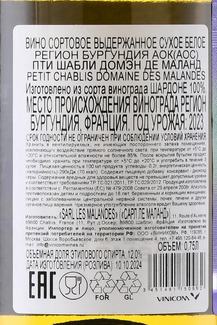 Белое сухое вино Petit Chablis Domaine des Malandes 2022 г. 0,75 л произведено в одноименном апелласьоне Бургундии, который занимает небольшую площадь и характеризуется преобладающими древними отложениями известняка в почвах и полуконтинентальным климатом. Урожай спелых ягод собрали в один год при помощи машин и внимательно отсортировали. Напиток прошел традиционные этапы яблочно-молочного брожения и вызревания в стальных цистернах сроком от полугода до восьми месяцев.