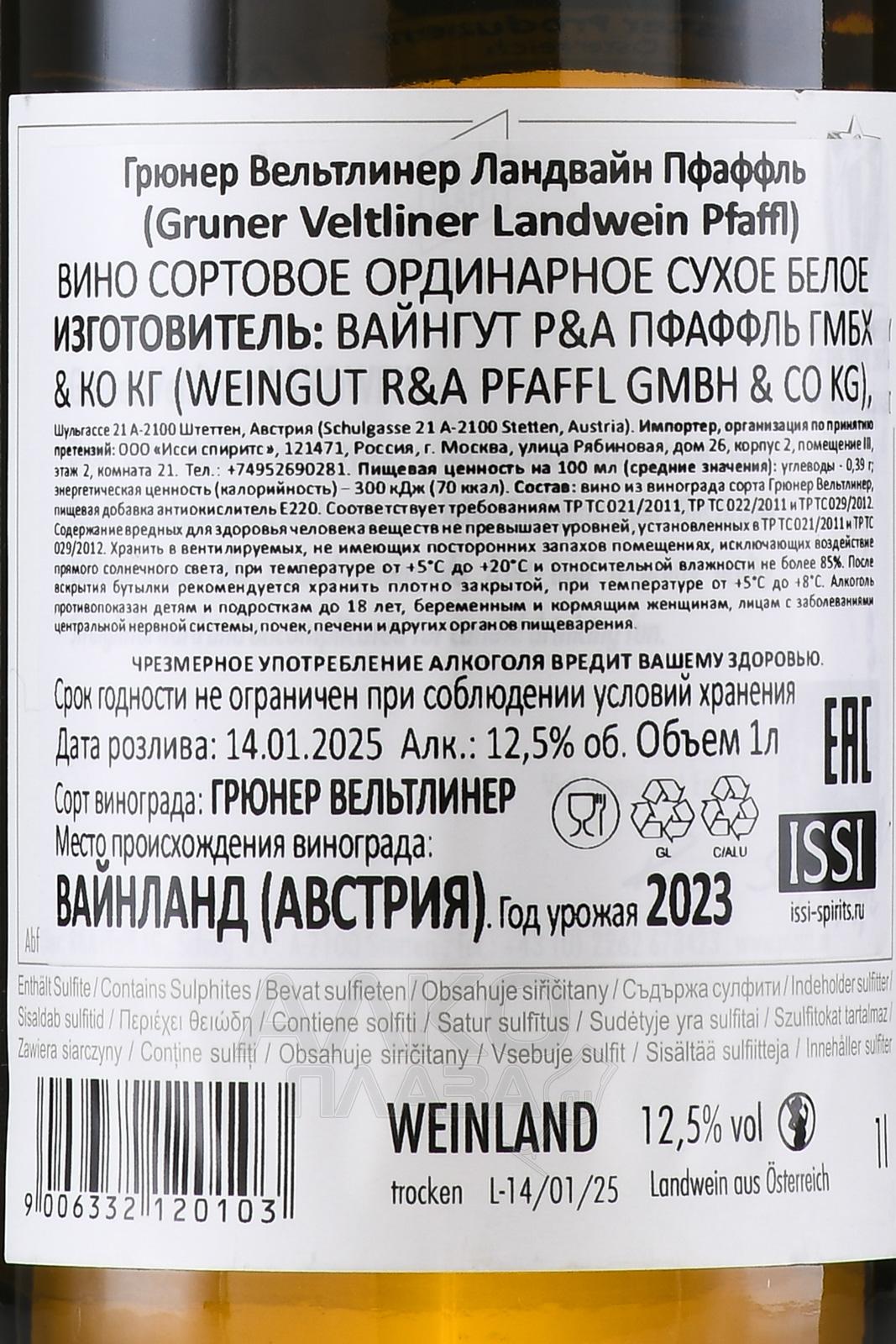 Белое сухое вино Pfaffl Gruner Veltliner Landwein 1 л производят на северо-востоке Нижней Австрии, где хозяйство работает с участками Вайнфиртеля и окрестных холмов. Виноград выращивают на лёссовых и песчаных почвах, отличающихся хорошей водопроницаемостью. Эти терруары дают сырье с высокой естественной кислотностью и стабильной зрелостью. Урожай собирают в начале осени, стремясь сохранить свежую органолептику. Брожение проходит в стальных резервуарах при низкой температуре, обеспечивающей чистый ароматический рисунок. Напиток выпускают в литровой бутылке, ориентированной на повседневный стиль и более широкий формат потребления.