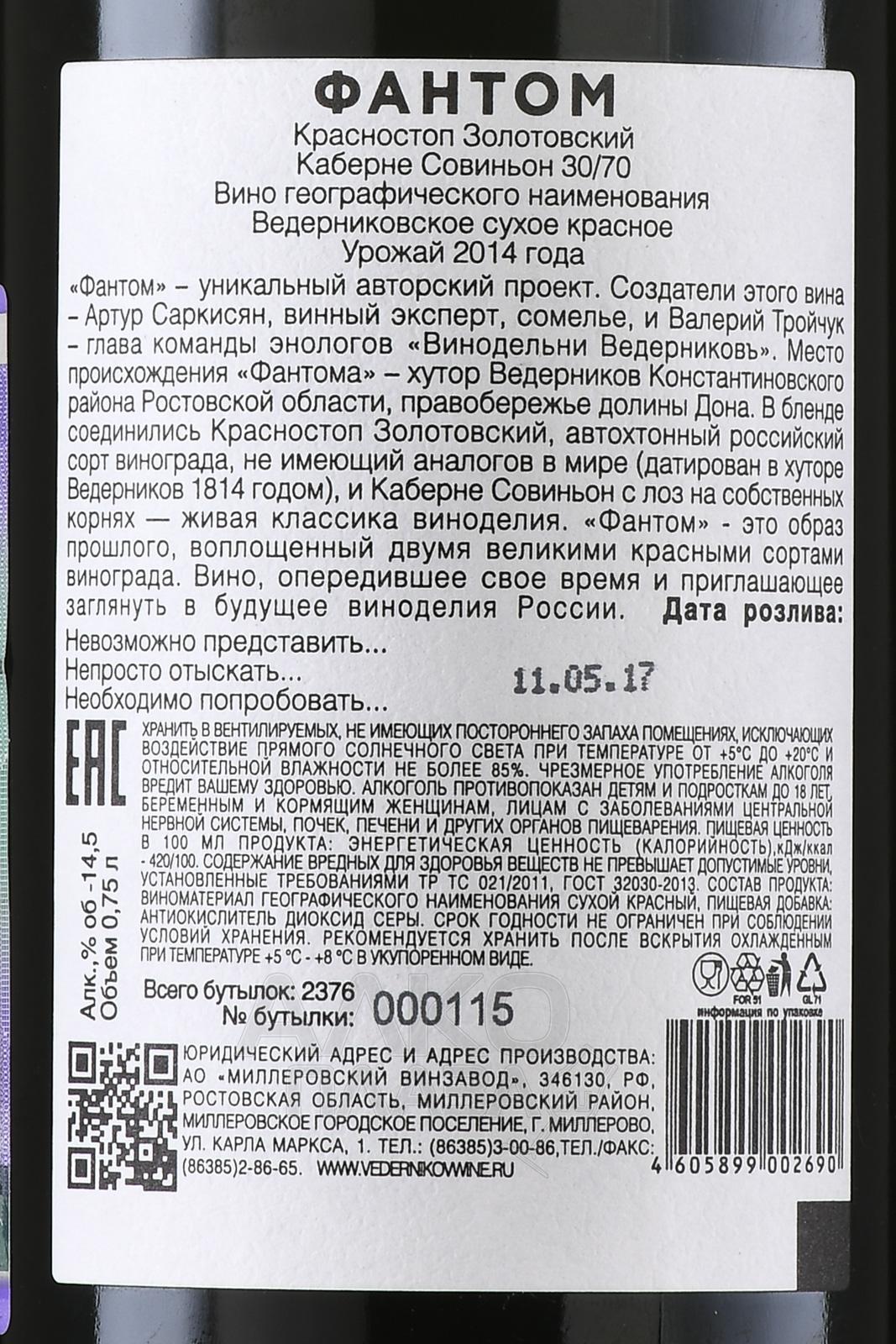 Красное сухое вино Phantom Krasnostop Zolotovskiy Cabernet Sauvignon 30/70 0,75 л — качественный алкоголь с яркими чертами терруара Ростовской области РФ, который состоит из двух сортов винограда, обозначенных в его названии. Это спиртное является флагманским напитком компании и создается только в лучшие урожайные годы. Изготовление выполнили по европейской методике терморегулируемого брожения с делестажем и вызревания в бочонках из цельной французской дубовой древесины, которое продлилось не менее восьми месяцев. Специалисты рекомендуют дать вину «подышать» перед дегустацией, кроме того, ему не повредит декантация.
