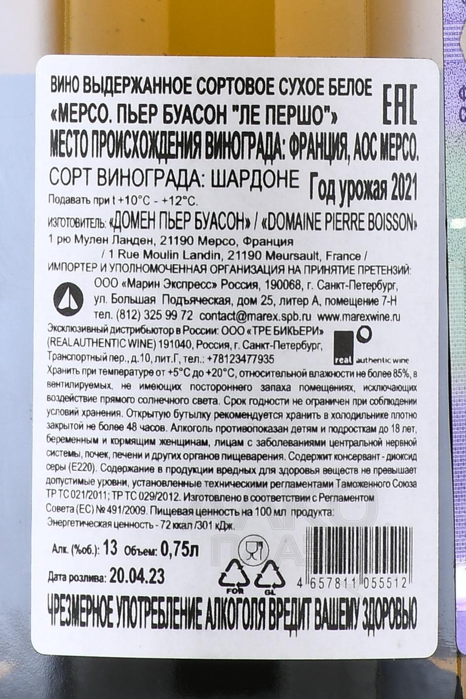 Pierre Boisson Meursault Les Perchots - вино Пьер Буасон Ле Першо Мерсо 0.75 л белое сухое