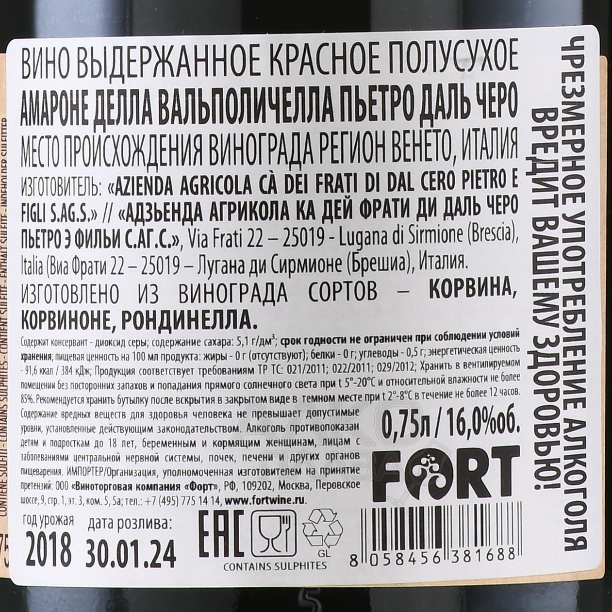 Красное полусухое вино Pietro dal Cero Amarone della Valpolicella 0,75 л создано в классическом стиле региона Венето. Виноград выращен на холмах с известняковыми и вулканическими почвами, которые придают вину мощность и минеральность. Для производства используется традиционный метод аппассименто: ягоды сушат несколько месяцев, концентрируя вкус и аромат. Ферментация проходит медленно, при контролируемой температуре. Выдержка длительная, протекает в несколько этапов: 24 месяца — в дубовых бочках, 12 месяцев — в стальных резервуарах и еще 2 года — в бутылках. Такой подход обеспечивает вину великолепную структуру и глубину вкуса. Пьетро Даль Черо Амароне делла Вальполичелла известно высокими оценками критиков и входит в список лучших вин своей категории, регулярно получая награды на международных конкурсах.
