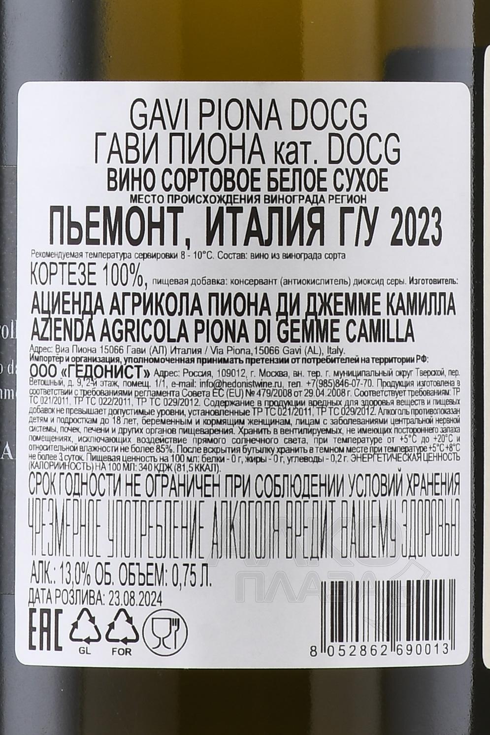 Белое сухое вино Piona Gavi 0,75 л создается в регионе Пьемонт, в южной части провинции Алессандрия, где зона производства защищена статусом DOCG. Этот напиток рождается на лозах, высаженных на холмистых известняково-глинистых склонах, которые придают ягодам характерную минеральность. Виноградники расположены на высоте от 200 до 400 метров над уровнем моря. Здесь умеренный климат, формируемый влиянием Лигурийского моря и холодных альпийских ветров, обеспечивает баланс между свежестью и структурой плодов. Производство напитка традиционно: ручной сбор урожая, мягкое прессование, ферментация при контролируемой температуре и выдержка на осадке для раскрытия полноты вкуса.