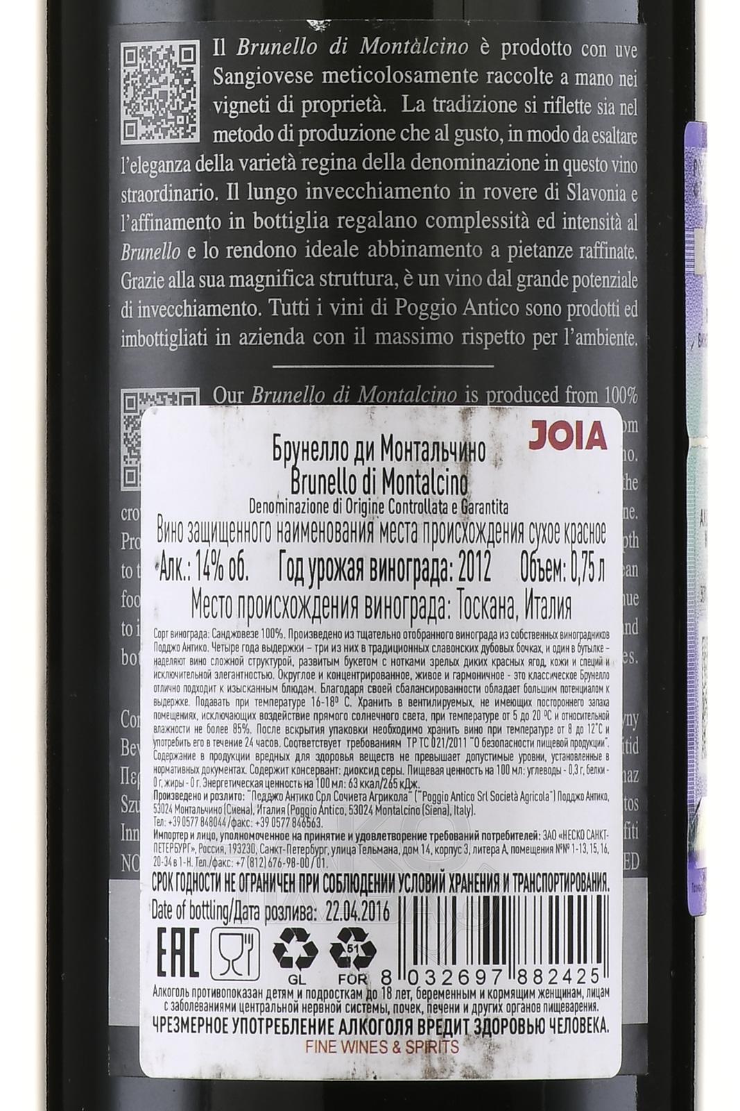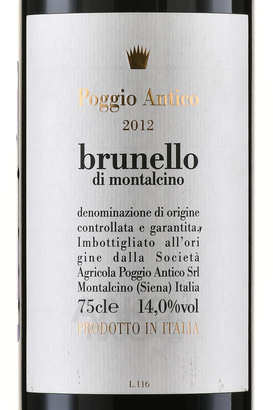 Красное сухое вино Poggio Antico Brunello di Montalcino 0,75 л — напиток из престижной тосканской зоны Брунелло ди Монтальчино, в которой создают одни из лучших итальянских вин. Сбор происходит по достижении ягодами оптимальной спелости с низкоурожайных участков. Процесс винификации протекает при контролируемой температуре, по завершении которой производится мацерация. Созревало готовое вино в больших бочках из славонского дуба на протяжении 30 месяцев, далее розлив и довыдержка в погребах винодельни на протяжении 18 месяцев.