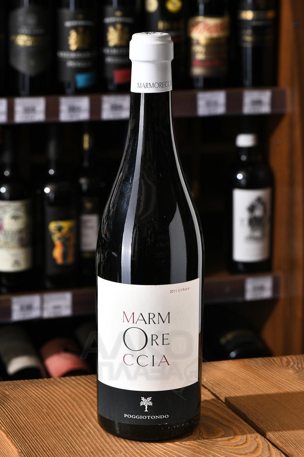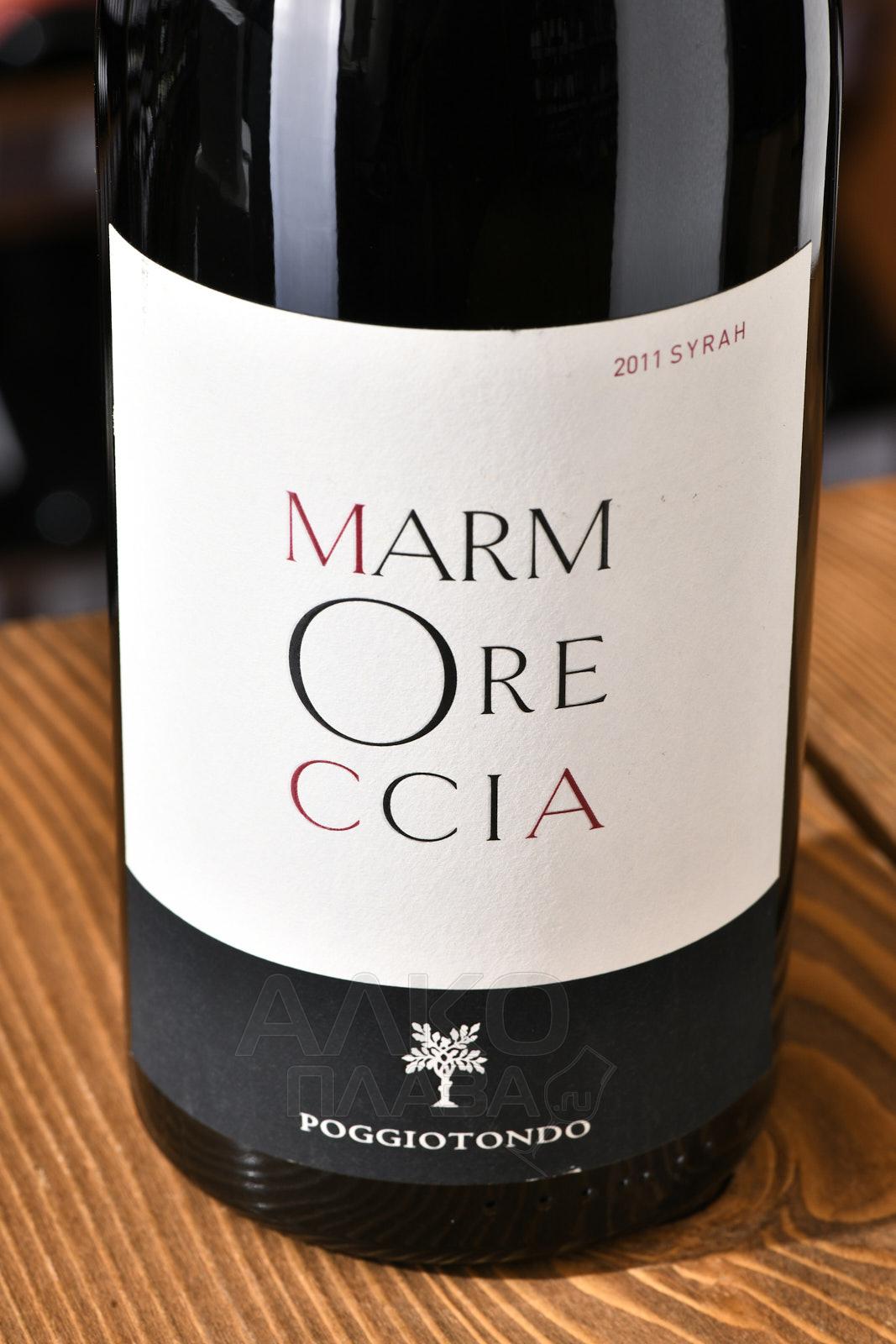 Красное сухое вино Poggiotondo Marmoreccia 2011 год 0,75 л — итальянское премиальное спиртное, представленное в рамках категории IGT. Его состав включает сорт Сира с тосканских участков, образованных древними породами органического происхождения. Мацерация и ферментация подготовленного урожая длились около 14 суток, эти процессы протекали под влиянием натуральных дрожжей. 20-месячная выдержка осуществилась во французском дубе. Вино предлагается нефильтрованным, также его не подвергали осветлению.