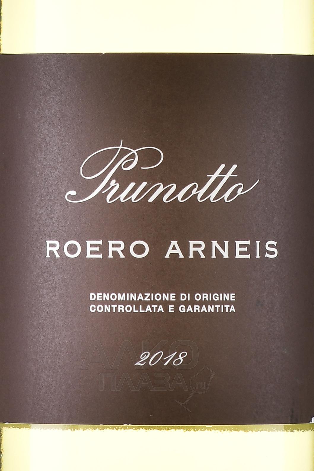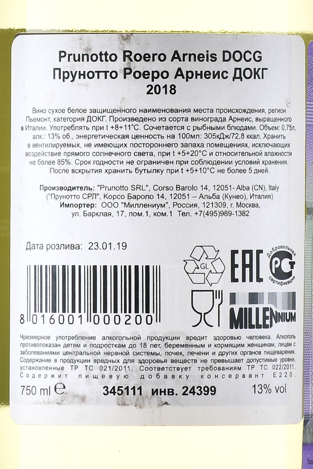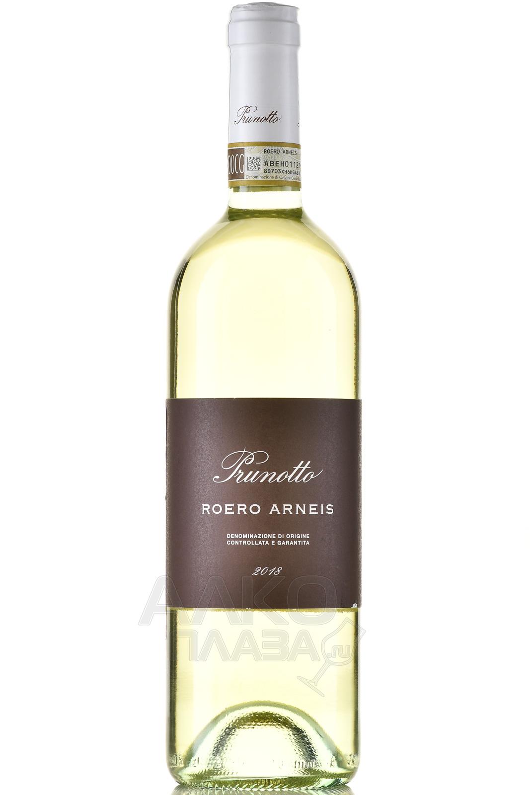 Белое сухое вино Prunotto Roero Arneis DOCG 2018 г изготовлено из одноименного сорта винограда — Арнеис, выращенного на территории итальянской области Пьемонт, в горах Роэро. Ягоды для 13-градусного винтажа собрали вручную в 2018 году с плантаций, образованных богатыми глинисто-песчаными и известняковыми отложениями. Сырье подверглось мягкому отжиму и окислению при контролируемой температуре 18 °C на протяжении 15 суток. Завершающей стадией производства стала выдержка в стальных резервуарах на протяжении нескольких месяцев. Потенциал вина к вызреванию — до трех лет.